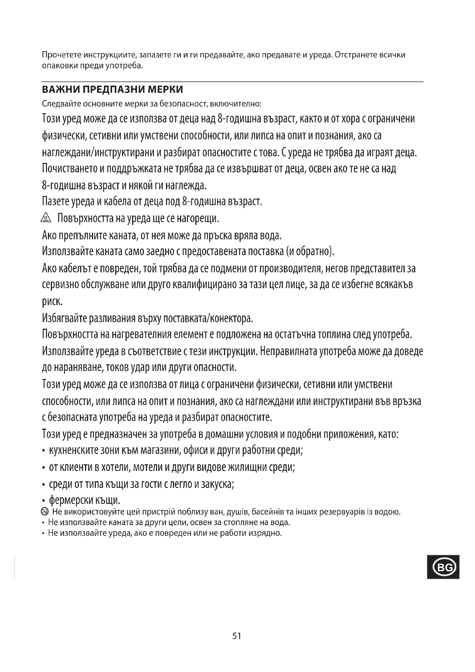 Избягвайте разливания върху поставката/конектора. Повърхността на нагревателния елемент е подложена на остатъчна топлина след употреба. Използвайте уреда в съответствие с тези инструкции. Неправилната употреба може да доведе до нараняване, токов удар или други опасности. Този уред може да се използва от лица с ограничени физически, сетивни или умствени способности, или липса на опит и познания, ако са наглеждани или инструктирани във връзка с безопасната употреба на уреда и разбират опасностите. Този уред е предназначен за употреба в домашни условия и подобни приложения, като: