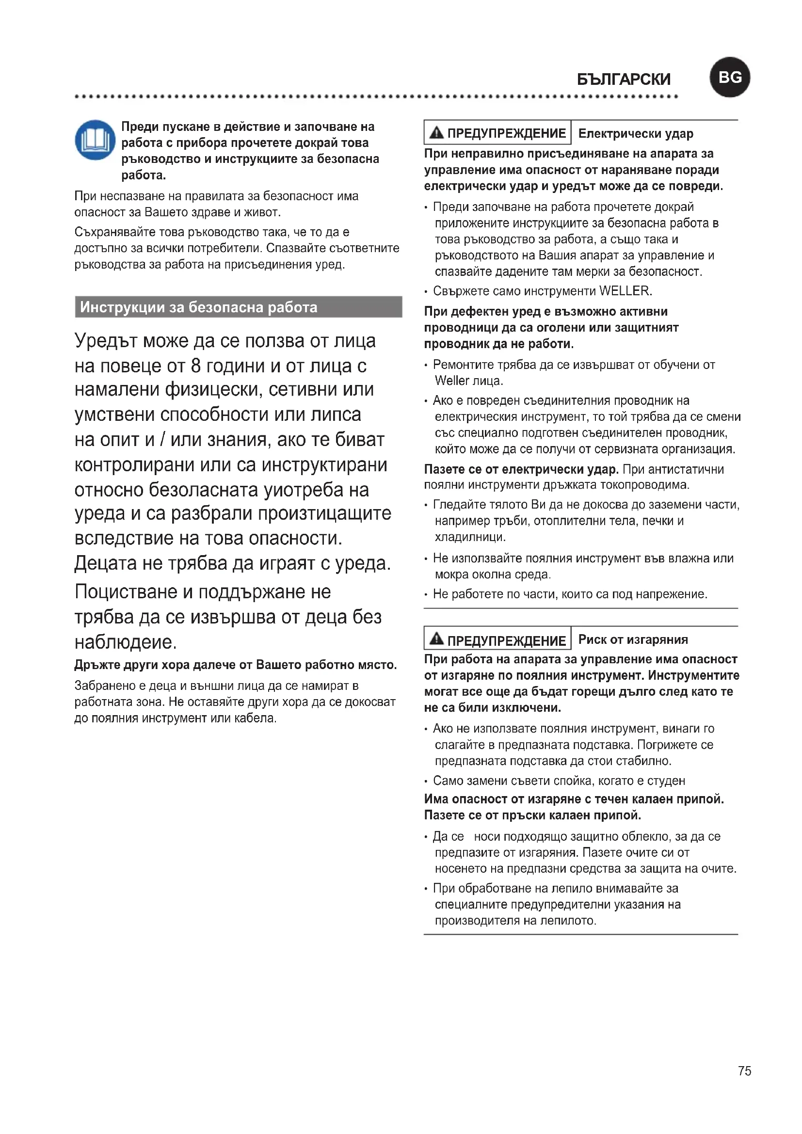 - Неработетепочасти,коитосаподнапрежение. ПРЕДУПРЕЖДЕНИЕ Риск от изгаряния При работа на апарата за управление има опасност от изгаряне по поялния инструмент. Инструментите могат все още да бъдат горещи дълго след като те не са били изключени.