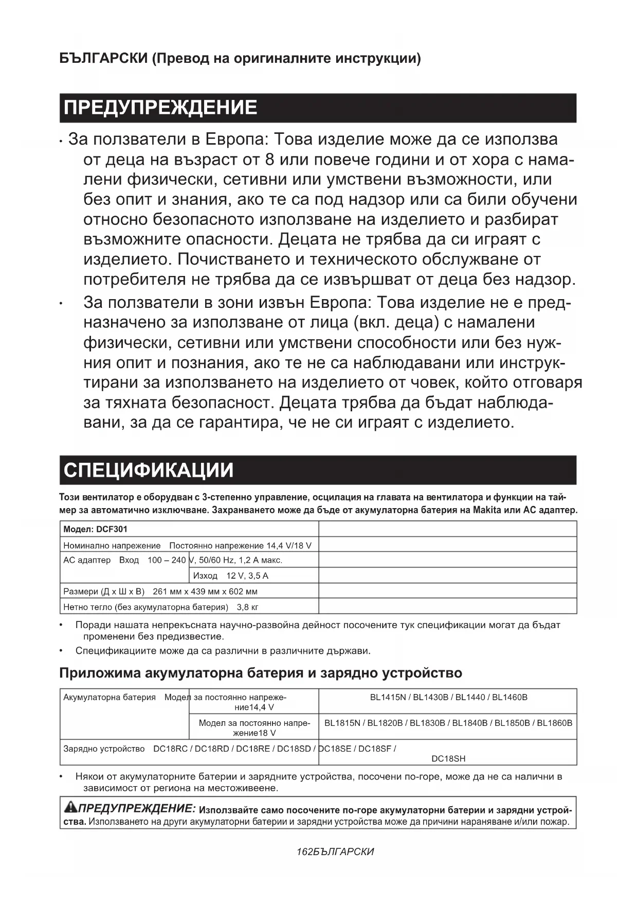 ЗаползвателивзониизвънЕвропа:Товаизделиенеепред- назначенозаизползванеотлица(вкл.деца)снамалени физически,сетивниилиумствениспособностиилибезнуж- нияопитипознания,акотенесанаблюдаваниилиинструк- тиранизаизползванетонаизделиетоотчовек,койтоотговаря затяхнатабезопасност.Децататрябвадабъдатнаблюда- вани,задасегарантира,ченесииграятсизделието. СПЕЦИФИКАЦИИ Този вентилатор е оборудван с 3-степенно управление, осцилация на главата на вентилатора и функции на тай- мер за автоматично изключване. Захранването може да бъде от акумулаторна батерия на Makita или AC адаптер. Модел: DCF301Номиналнонапрежение Постояннонапрежение14,4V/18VACадаптер Вход 100–240V,50/60Hz,1,2Aмакс.Изход 12 V, 3,5 AРазмери(ДxШxВ) 261ммx439ммx602ммНетнотегло(безакумулаторнабатерия) 3,8кг