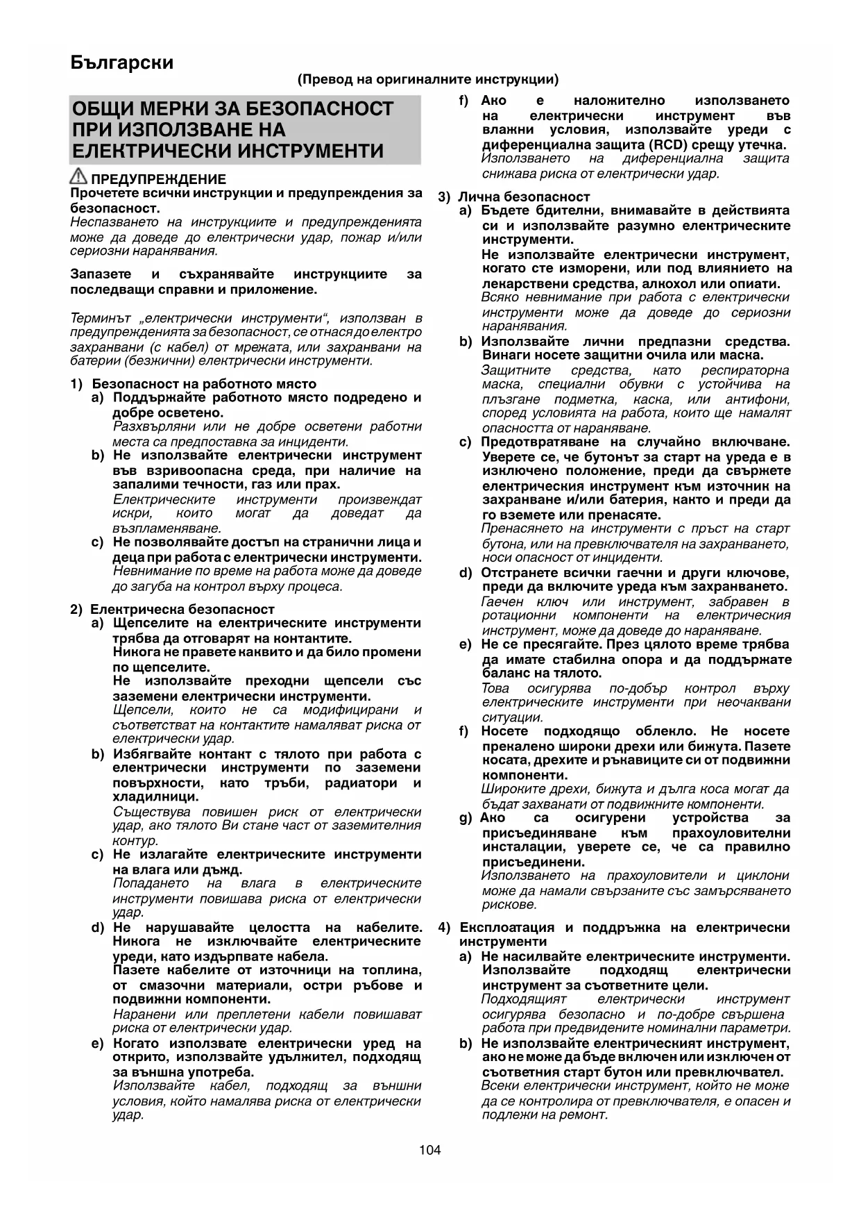 инструменти a) Не насилвайте електрическите инструменти. Използвайте подходящ електрически инструмент за съответните цели. Подходящият електрически инструмент осигурява безопасно и по-добре свършена работа при предвидените номинални параметри. b) Не използвайте електрическият инструмент, ако не може да бъде включен или изключен от съответния старт бутон или превключвател. Всеки електрически инструмент, който не може да се контролира от превключвателя, е опасен и подлежи на ремонт. ОБЩИ МЕРКИ ЗА БЕЗОПАСНОСТ ПРИ ИЗПОЛЗВАНЕ НА ЕЛЕКТРИЧЕСКИ ИНСТРУМЕНТИ ПРЕДУПРЕЖДЕНИЕ Прочетете всички инструкции и предупреждения за безопасност. Неспазването на инструкциите и предупрежденията може да доведе до електрически удар, пожар и/или сериозни наранявания. Запазете и съхранявайте инструкциите за последващи справки и приложение. Терминът „електрически инструменти“, използван в предупрежденията за безопасност, се отнася до електро захранвани (с кабел) от мрежата, или захранвани на батерии (безжични) електрически инструменти.