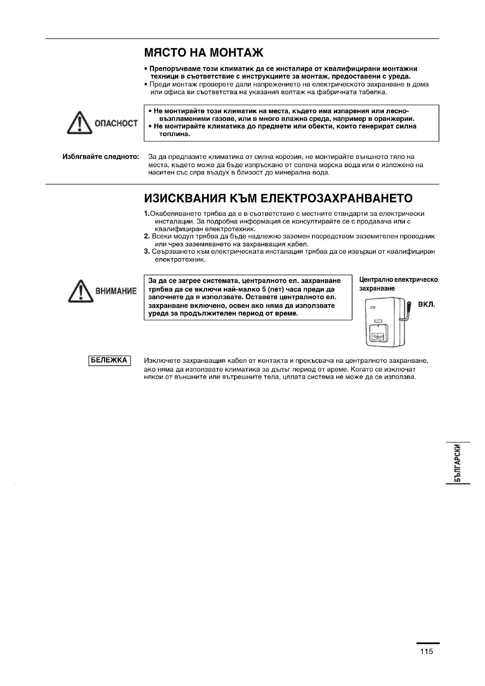 Избягвайте следното: За да предпазите климатика от силна корозия, не монтирайте външното тяло на места, където може да бъде изпръскано от солена морска вода или е изложено на наситен със сяра въздух в близост до минерална вода. За да се загрее системата, централното ел. захранване трябва да се включи най-малко 5 (пет) часа преди да започнете да я използвате. Оставете централното ел. захранване включено, освен ако няма да използвате уреда за продължителен период от време. Изключете захранващия кабел от контакта и прекъсвача на централното захранване, ако няма да използвате климатика за дълъг период от време. Когато се изключат някои от външните или вътрешните тела, цялата система не може да се използва. Централно електрическо