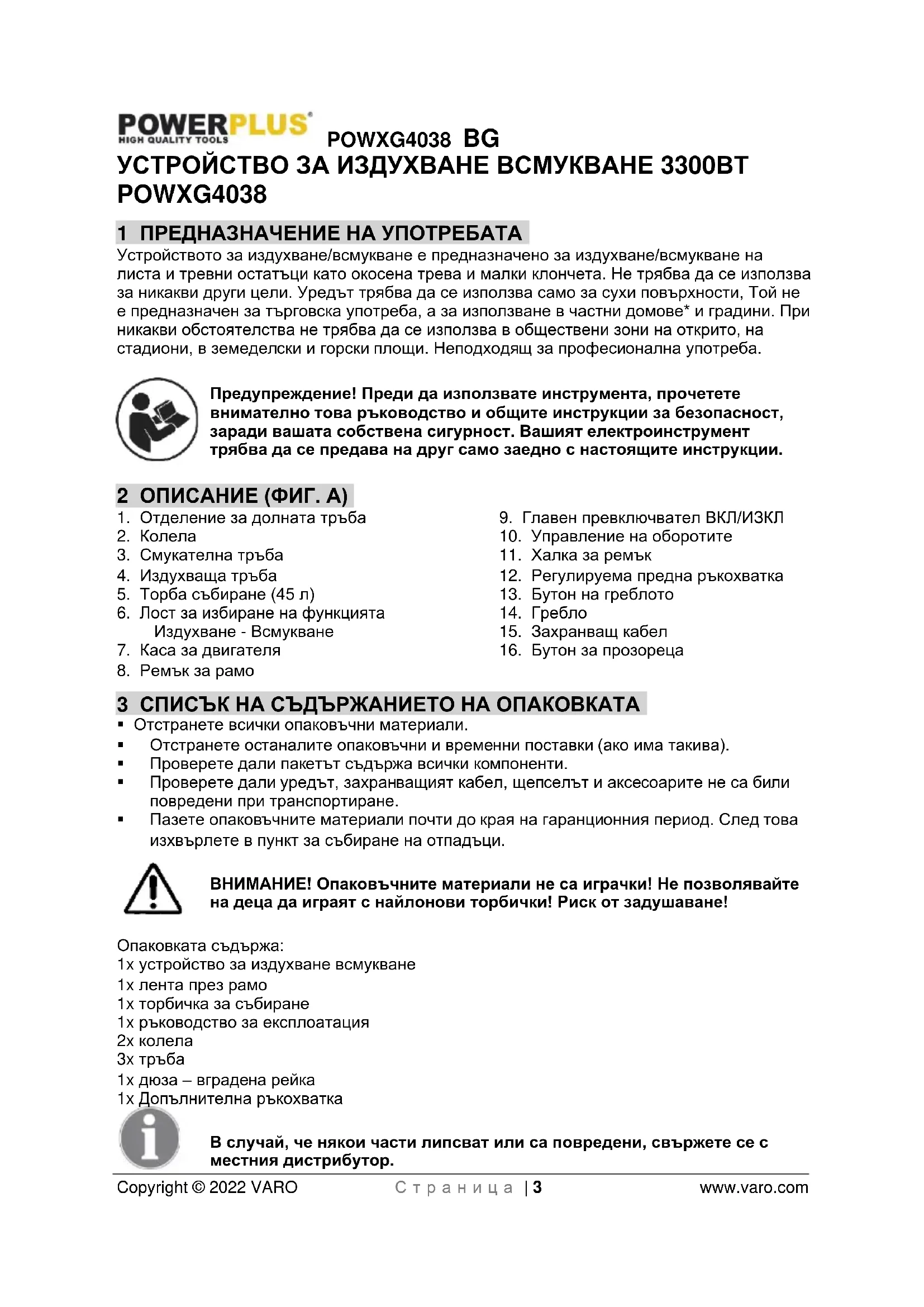 POWXG4038 - Духалка PowerPlus - Безплатно ръководство за потребителя