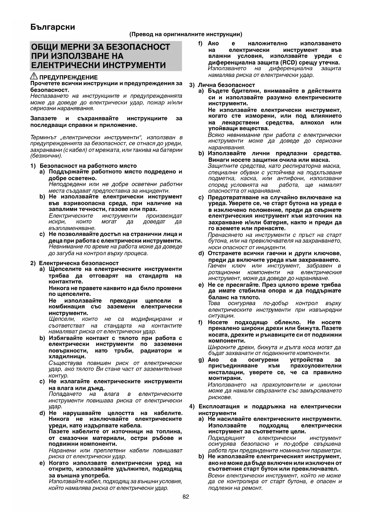 безопасно и по-добре свършена работа при предвидените номинални параметри. b) Не използвайте електрическият инструмент, ако не може да бъде включен или изключен от съответния старт бутон или превключвател. Всеки електрически инструмент, който не може да се контролира от старт бутона, е опасен и подлежи на ремонт. ОБЩИ МЕРКИ ЗА БЕЗОПАСНОСТ ПРИ ИЗПОЛЗВАНЕ НА ЕЛЕКТРИЧЕСКИ ИНСТРУМЕНТИ ПРЕДУПРЕЖДЕНИЕ Прочетете всички инструкции и предупреждения за безопасност. Неспазването на инструкциите и предупрежденията може да доведе до електрически удар, пожар и/или сериозни наранявания. Запазете и съхранявайте инструкциите за последващи справки и приложение. Терминът „електрически инструменти“, използван в предупрежденията за безопасност, се отнася до уреди, захранвани (с кабел) от мрежата, или такива на батерии (безжични).