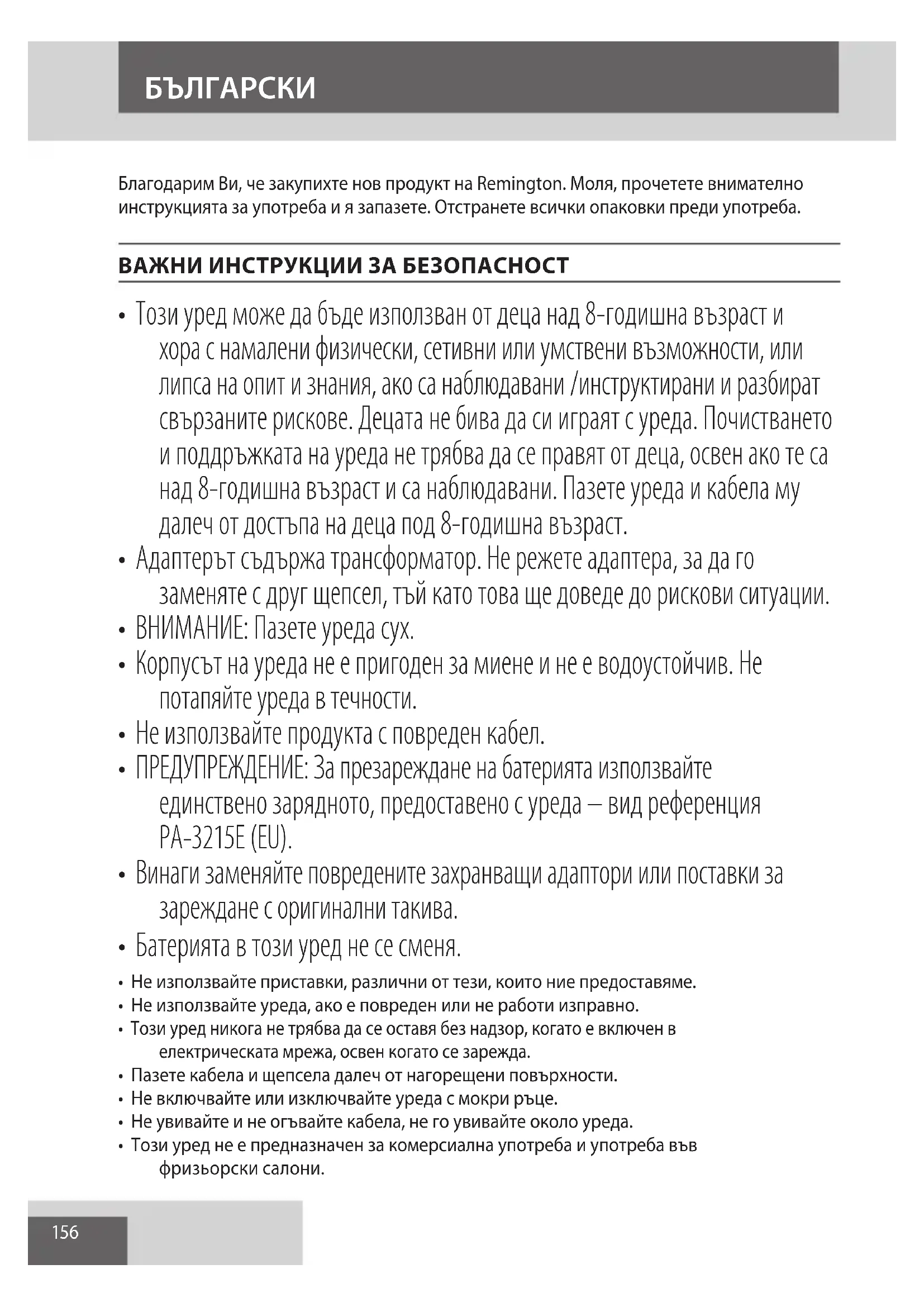 УКРАЇНСЬКА156 Благодарим Ви, че закупихте нов продукт на Remington. Моля, прочетете внимателно инструкцията за употреба и я запазете. Отстранете всички опаковки преди употреба. ВАЖНИ ИНСТРУКЦИИ ЗА БЕЗОПАСНОСТ