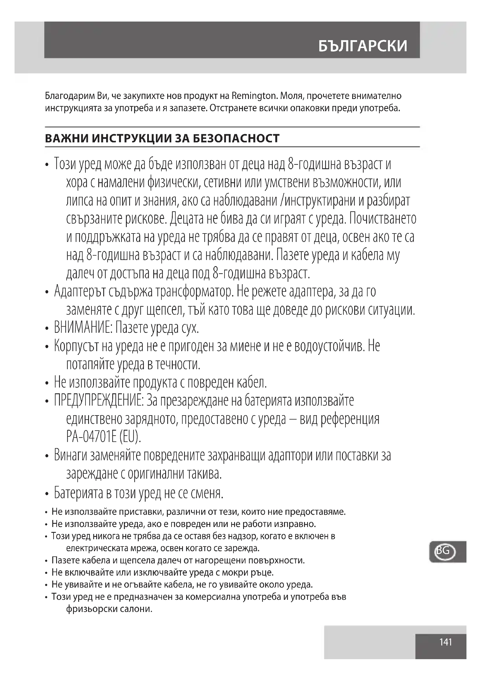 Благодарим Ви, че закупихте нов продукт на Remington. Моля, прочетете внимателно инструкцията за употреба и я запазете. Отстранете всички опаковки преди употреба. ВАЖНИ ИНСТРУКЦИИ ЗА БЕЗОПАСНОСТ