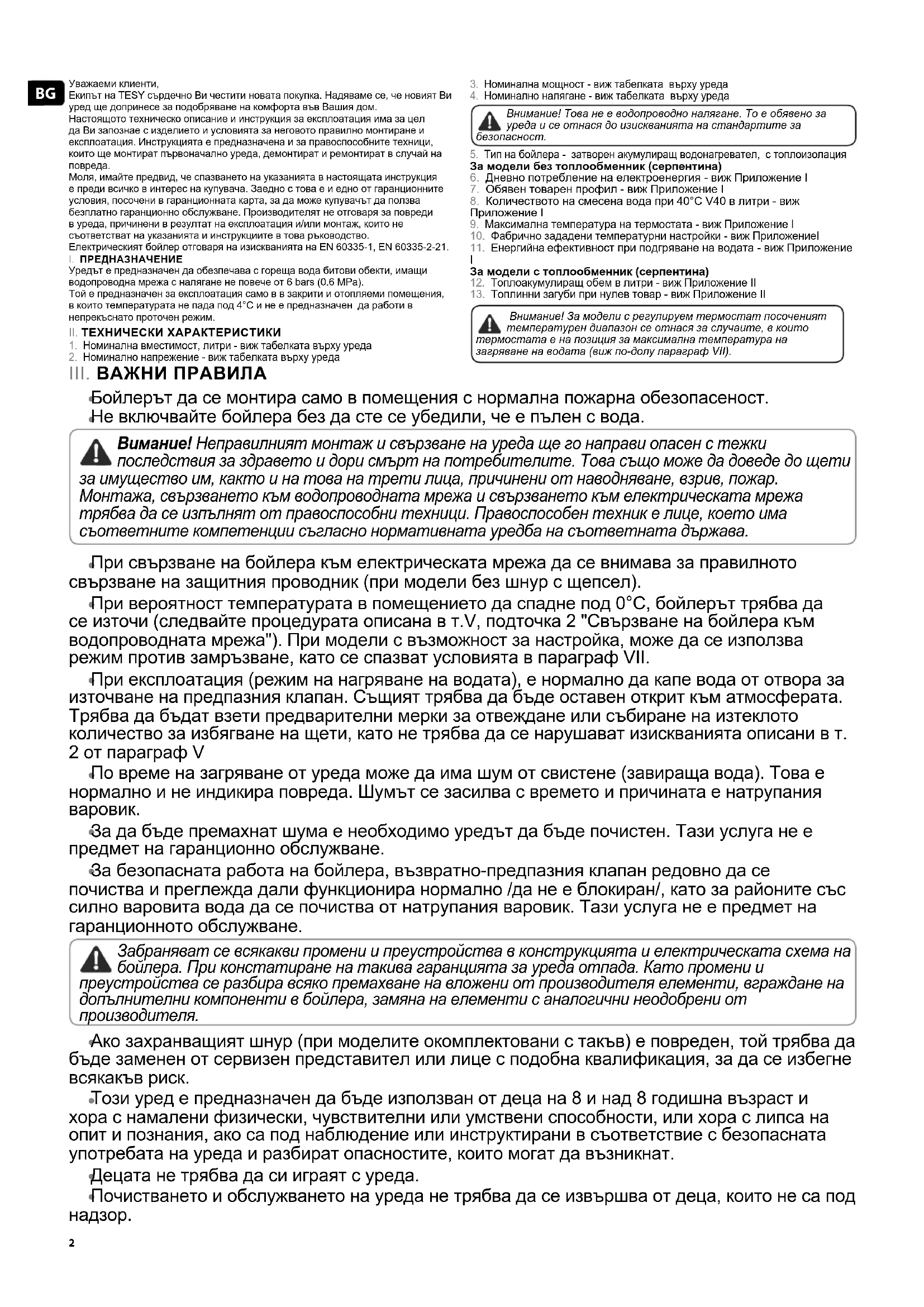 При нормална работа на бойлера, под въздействието на високата температура на повърхността на нагревателя се отлага варовик /т.н.котлен камък/. Това влошава топлообмена между нагревателя и водата. Температурата на повърхността на нагревателя и в зоната около него се повишава. Появява се характерен шум /на завираща вода/. Терморегулатора започва да включва и изключва по-често. Възможно е “лъжливо” задействане на температурната защита. Поради това производителят на този уред препоръчва профилактика на всеки две години на Вашият бойлер от оторизиран сервизен център или сервизна база, като услугата е за сметка на клиента. Тази профилактика трябва да включва почистване и преглед на анодния протектор (при бойлери със стъклокерамично покритие), който при необходимост да се замени с нов. За да почистите уреда използвайте влажна кърпа. Не използвайте абразивни или съдържащи разтворител почистващи вещества. Производителят не носи отговорност за всички последици, вследствие неспазване на настоящата инструкция. Указания за опазване на околната среда Старите електроуреди съдържат ценни материали и поради това не трябва да се изхвърлят заедно с битовата смет! Молим Ви да съдействате с активния си принос за опазване на ресурсите и околната среда и да предоставите уреда в организираните изкупвателни пунктове(ако има такива).5 English