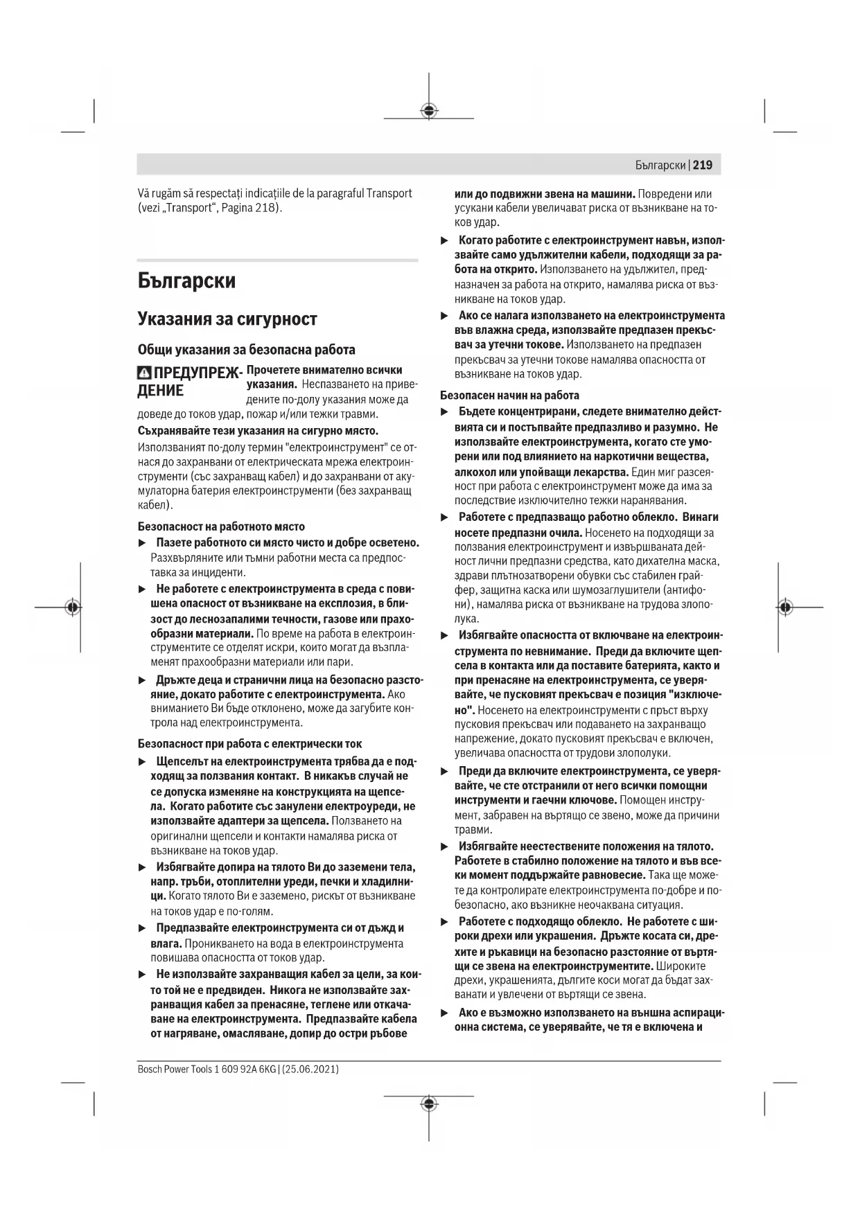 u Избягвайте неестествените положения на тялото. Работете в стабилно положение на тялото и във все- ки момент поддържайте равновесие. Така ще може- те да контролирате електроинструмента по-добре и по- безопасно, ако възникне неочаквана ситуация. u Работете с подходящо облекло. Не работете с ши- роки дрехи или украшения. Дръжте косата си, дре- хите и ръкавици на безопасно разстояние от въртя- щи се звена на електроинструментите. Широките дрехи, украшенията, дългите коси могат да бъдат зах- ванати и увлечени от въртящи се звена. u Ако е възможно използването на външна аспираци- онна система, се уверявайте, че тя е включена и Bosch Power Tools 1 609 92A 6KG | (25.06.2021)220 | Български функционира изправно. Използването на аспираци- онна система намалява рисковете, дължащи се на от- делящи се при работа прахове. Грижливо отношение към електроинструментите u Не претоварвайте електроинструмента. Използ- вайте електроинструментите само съобразно тях- ното предназначение. Ще работите по‑добре и по‑безопасно, когато използвате подходящия електро- инструмент в зададения от производителя диапазон на натоварване. u Не използвайте електроинструмент, чиито пусков прекъсвач е повреден. Електроинструмент, който не може да бъде изключван и включван по предвидения от производителя начин, е опасен и трябва да бъде ре-