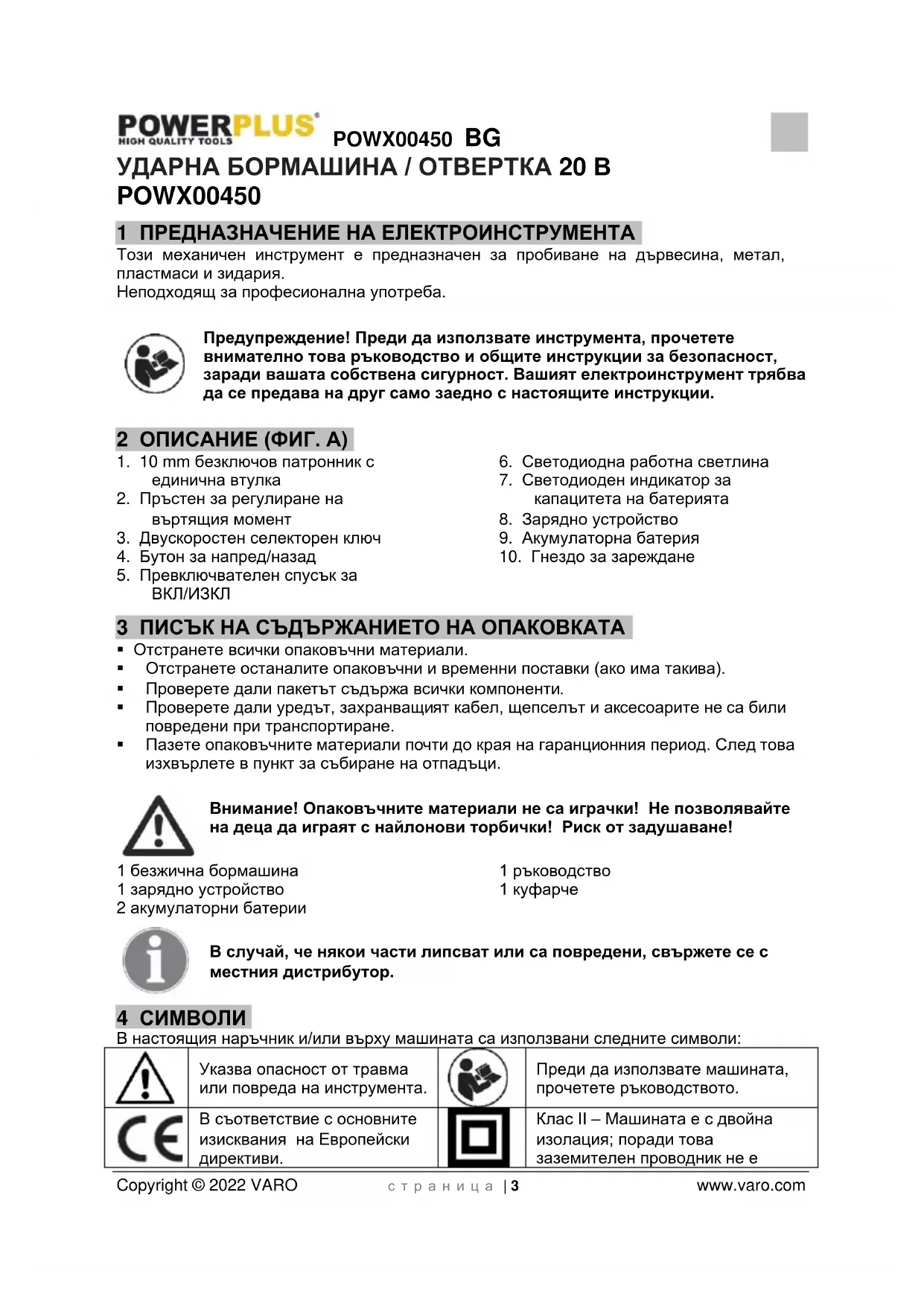 Клас II – Машината е с двойна изолация; поради това заземителен проводник не еPOWX00450 BG Copyright © 2022 VARO с т р а н и ц а | 4 www.varo.com