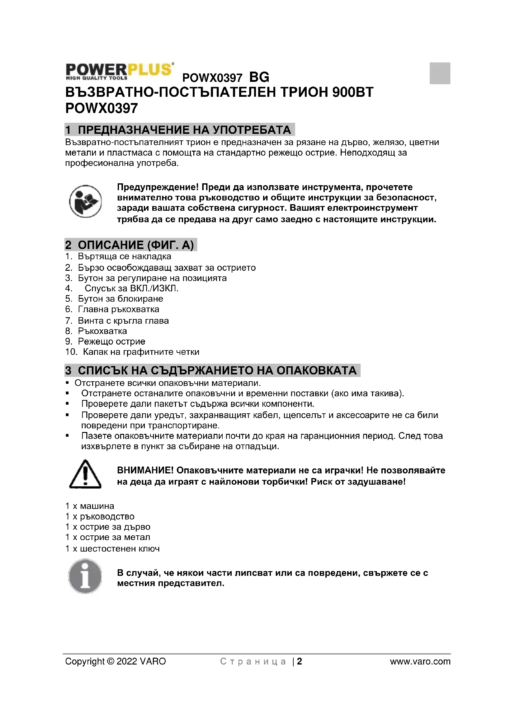 - 14 ДЕКЛАРАЦИЯ ЗА СЪОТВЕТСТВИЕ POWX0397 BG Copyright © 2022 VARO С т р а н и ц а | 2 www.varo.com ВЪЗВРАТНО-ПОСТЪПАТЕЛЕН ТРИОН 900ВТ POWX0397 1 ПРЕДНАЗНАЧЕНИЕ НА УПОТРЕБАТА Възвратно-постъпателният трион е предназначен за рязане на дърво, желязо, цветни метали и пластмаса с помощта на стандартно режещо острие. Неподходящ за професионална употреба. Предупреждение! Преди да използвате инструмента, прочетете внимателно това ръководство и общите инструкции за безопасност, заради вашата собствена сигурност. Вашият електроинструмент трябва да се предава на друг само заедно с настоящите инструкции. 2 ОПИСАНИЕ (ФИГ. A) p. 10