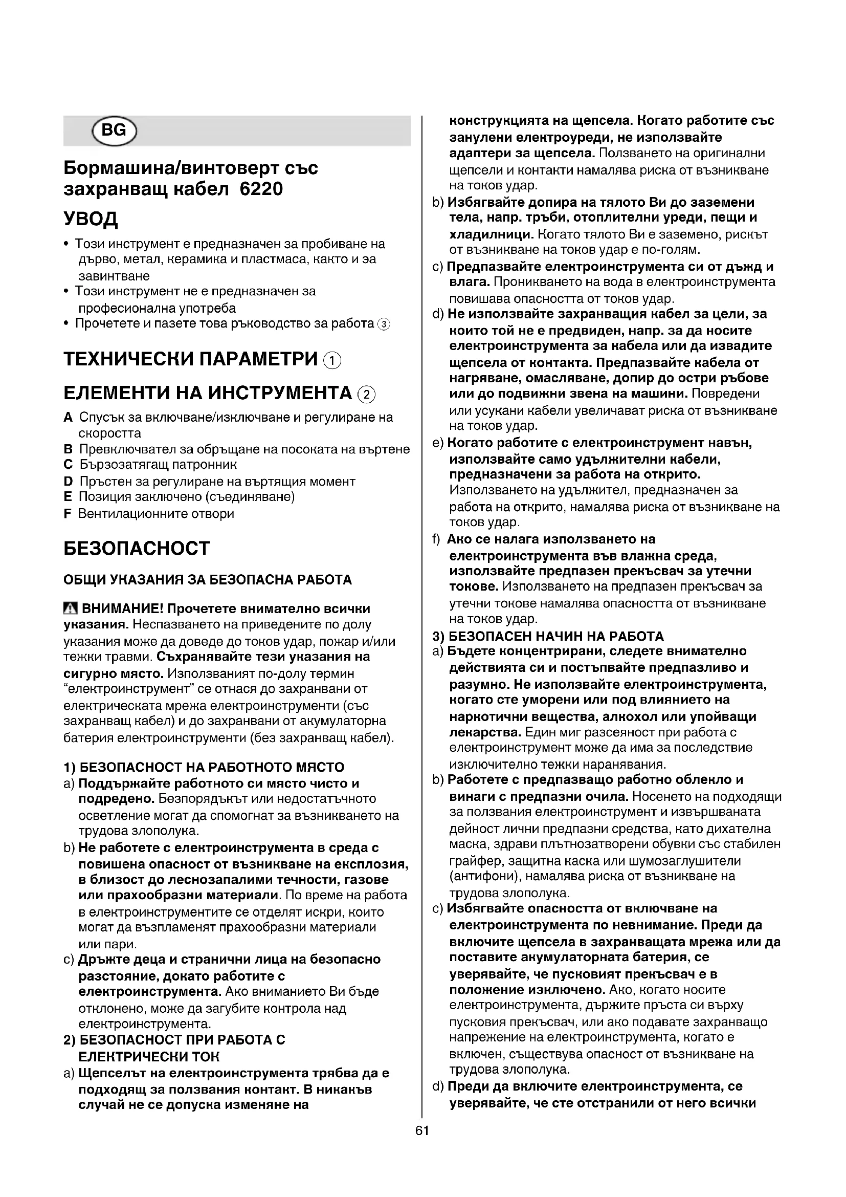 ЕЛЕМЕНТИНАИНСТРУМЕНТА 2 A Спусък за включване/изключване и pегулиpане на скоpостта B Пpевключвател за обpъщане на посоката на въpтене C Бързозатягащ патронник D Пръстен за регулиране на въртящия момент E Позиция заключено (съединяване) F Вентилационните отвоpи БЕЗОПАСНОСТ ОБЩИУКАЗАНИЯЗАБЕЗОПАСНА РАБОТА ВНИМАНИЕ!Прочететевнимателновсички указания. Неспазването на приведените по долу указания може да доведе до токов удар, пожар и/или тежки травми. Съхранявайтетезиуказанияна сигурномясто. Използваният по-долу термин “електроинструмент” се отнася до захранвани от електрическата мрежа електроинструменти (със захранващ кабел) и до захранвани от акумулаторна батерия електроинструменти (без захранващ кабел). 1)БЕЗОПАСНОСТНАРАБОТНОТО МЯСТО a) Поддържайтеработнотосимясточистои подредено. Безпорядъкът или недостатъчното осветление могат да спомогнат за възникването на трудова злополука. b) Неработетеселектроинструментавсредас повишенаопасностотвъзникваненаексплозия, вблизостдолеснозапалимитечности,газове илипрахообразниматериали. По време на работа в електроинструментите се отделят искри, които могат да възпламенят прахообразни материали