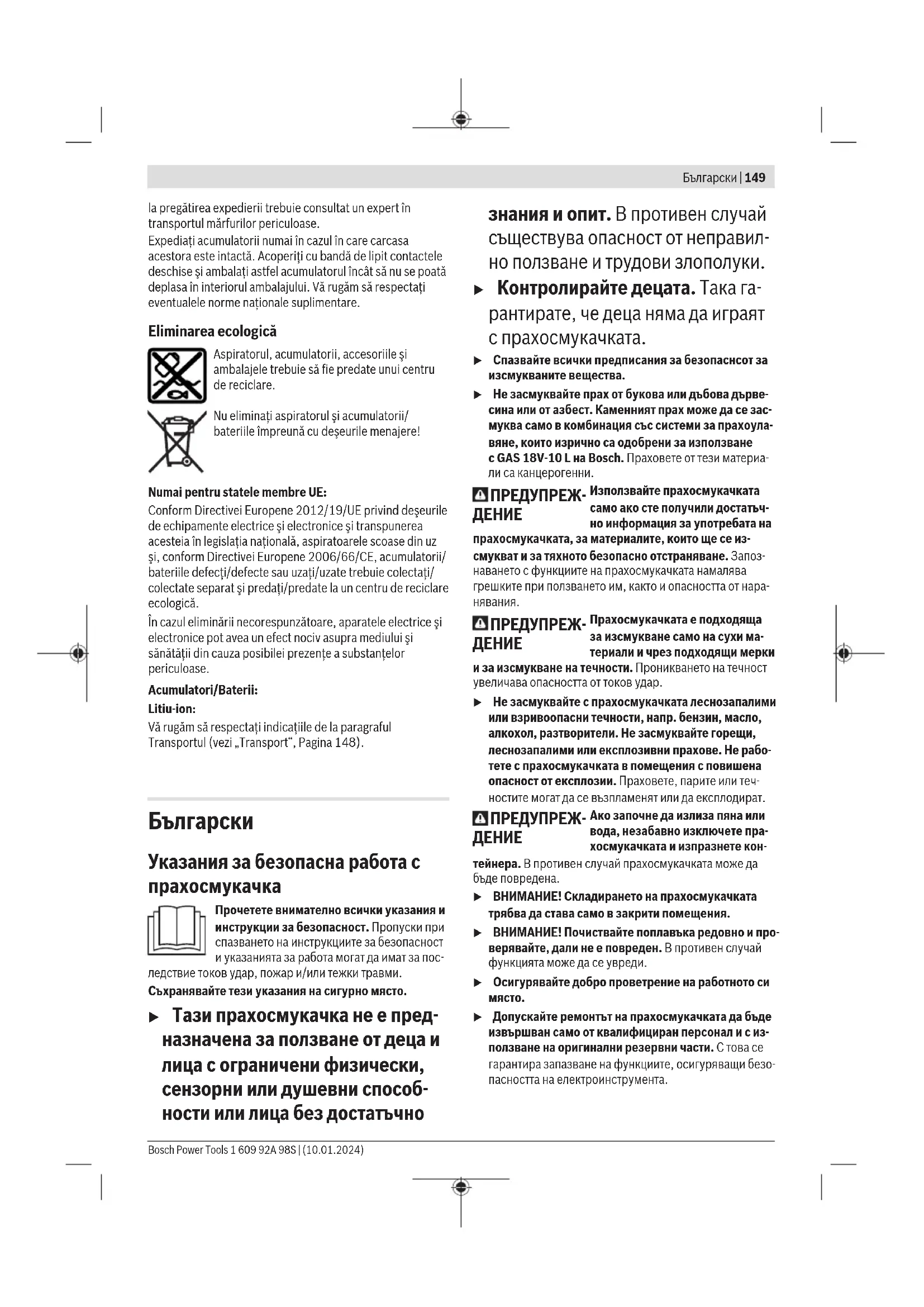 Ако започне да излиза пяна или вода, незабавно изключете пра- хосмукачката и изпразнете кон- тейнера. В противен случай прахосмукачката може да бъде повредена. u ВНИМАНИЕ! Складирането на прахосмукачката трябва да става само в закрити помещения. u ВНИМАНИЕ! Почиствайте поплавъка редовно и про- верявайте, дали не е повреден. В противен случай функцията може да се увреди. u Осигурявайте добро проветрение на работното си u Допускайте ремонтът на прахосмукачката да бъде извършван само от квалифициран персонал и с из- ползване на оригинални резервни части. С това се гарантира запазване на функциите, осигуряващи безо- пасността на електроинструмента. Bosch Power Tools 1 609 92A 98S | (10.01.2024)150 | Български