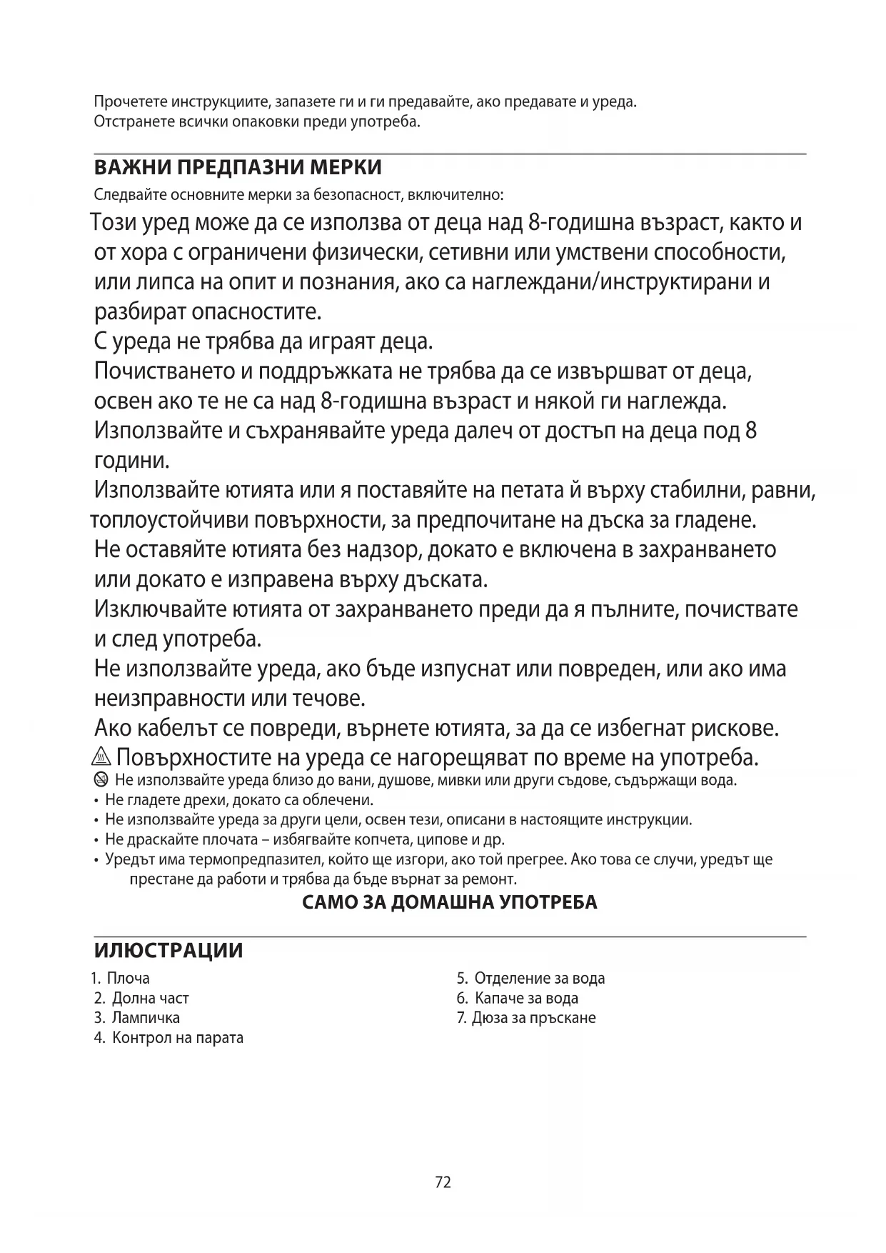 - Уредът има термопредпазител, който ще изгори, ако той прегрее. Ако това се случи, уредът ще престане да работи и трябва да бъде върнат за ремонт. САМО ЗА ДОМАШНА УПОТРЕБА