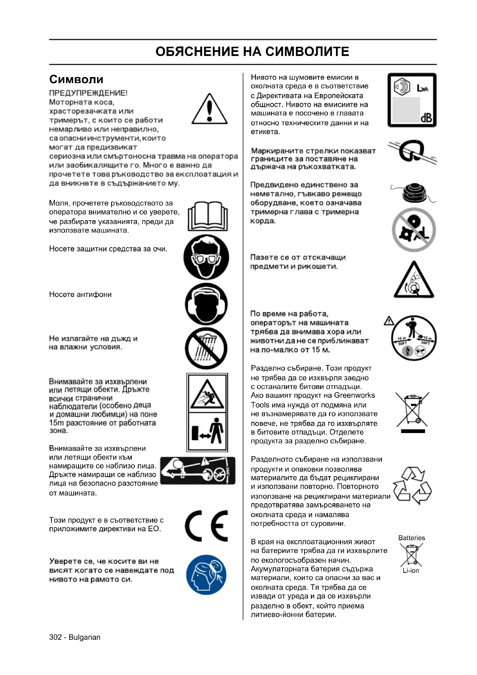 Разделно събиране. Този продукт не трябва да се изхвърля заедно с останалите битови отпадъци. Ако вашият продукт на Greenworks Tools има нужда от подмяна или не възнамерявате да го използвате повече, не трябва да го изхвърляте в битовите отпадъци. Отделете продукта за разделно събиране. Разделното събиране на използвани продукти и опаковки позволява материалите да бъдат рециклирани и използвани повторно. Повторното използване на рециклирани материали предотвратява замърсяването на околната среда и намалява потребността от суровини. В края на експлоатационния живот на батериите трябва да ги изхвърлите по екологосъобразен начин. Акумулаторната батерия съдържа материали, които са опасни за вас и околната среда. Тя трябва да се извади от уреда и да се изхвърли разделно в обект, който приема литиево-йонни батерии. Batteries Li-ion303Bulgarian -