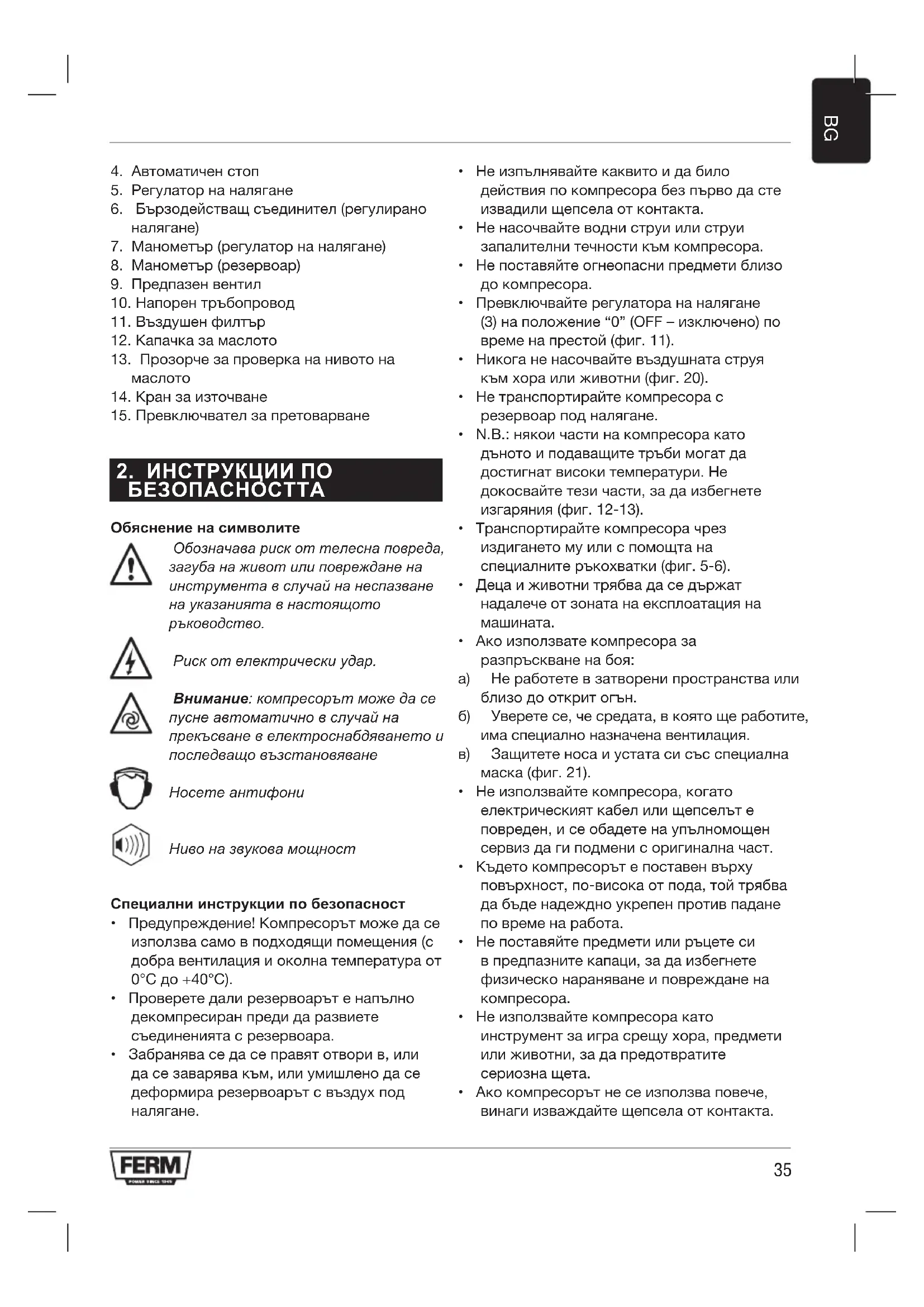 БЕЗОПАСНОСТТА Обяснение на символите Обозначаварискоттелеснаповреда, загубанаживотилиповрежданена инструментавслучайнанеспазване науказаниятавнастоящото ръководство. Рискотелектрическиудар. Внимание:компресорътможедасе пуснеавтоматичновслучайна прекъсваневелектроснабдяванетои последващовъзстановяване Носетеантифони Нивоназвуковамощност Специални инструкции по безопасност