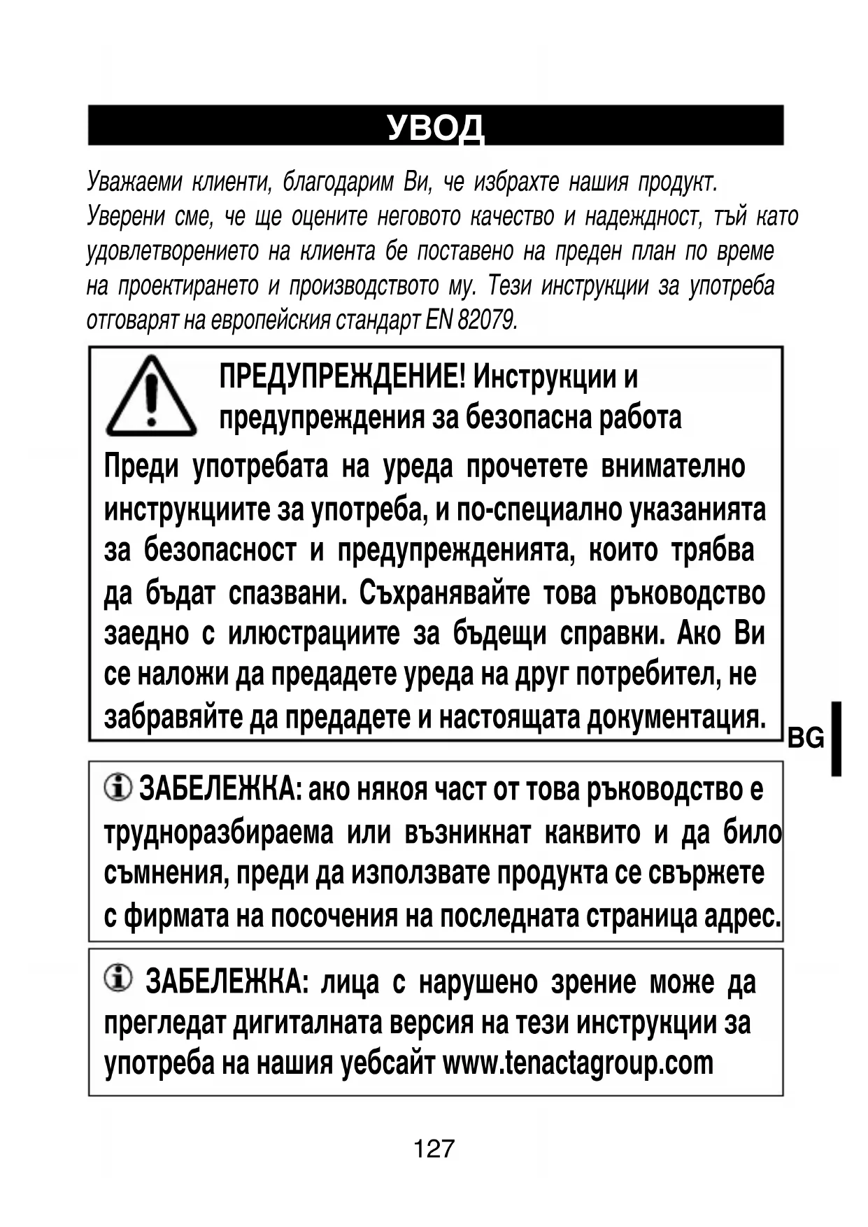 Уважаеми клиенти, благодарим Ви, че избрахте нашия продукт. Уверени сме, че ще оцените неговото качество и надеждност, тъй като удовлетворението на клиента бе поставено на преден план по време на проектирането и производството му. Тези инструкции за употреба отговарят на европейския стандарт EN 82079. ПРЕДУПРЕЖДЕНИЕ! Инструкции и предупреждения за безопасна работа Преди употребата на уреда прочетете внимателно инструкциите за употреба, и по-специално указанията за безопасност и предупрежденията, които трябва да бъдат спазвани. Съхранявайте това ръководство заедно с илюстрациите за бъдещи справки. Ако Ви се наложи да предадете уреда на друг потребител, не забравяйте да предадете и настоящата документация. ЗАБЕЛЕЖКА: ако някоя част от това ръководство е трудноразбираема или възникнат каквито и да било съмнения, преди да използвате продукта се свържете с фирмата на посочения на последната страница адрес. ЗАБЕЛЕЖКА: лица с нарушено зрение може да прегледат дигиталната версия на тези инструкции за употреба на нашия уебсайт www.tenactagroup.com128