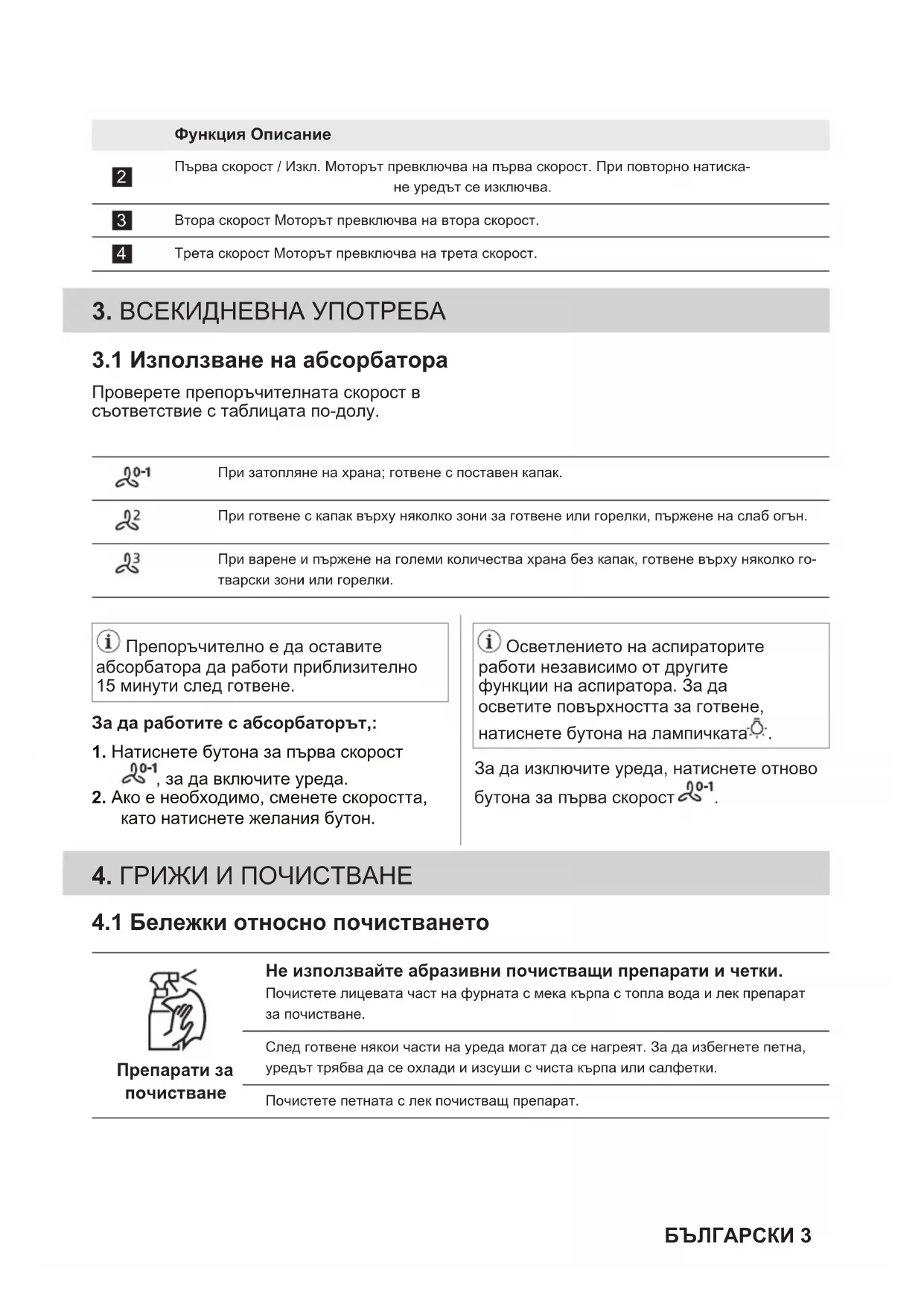 Не използвайте абразивни почистващи препарати и четки. Почистете лицевата част на фурната с мека кърпа с топла вода и лек препаратза почистване.След готвене някои части на уреда могат да се нагреят. За да избегнете петна,уредът трябва да се охлади и изсуши с чиста кърпа или салфетки.Почистете петната с лек почистващ препарат. БЪЛГАРСКИ 3Поддържайте абсорбатора