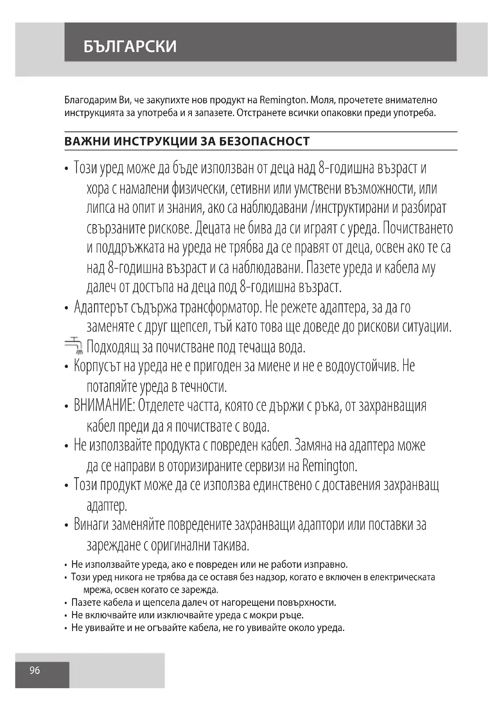 AE96 Благодарим Ви, че закупихте нов продукт на Remington. Моля, прочетете внимателно инструкцията за употреба и я запазете. Отстранете всички опаковки преди употреба. ВАЖНИ ИНСТРУКЦИИ ЗА БЕЗОПАСНОСТ