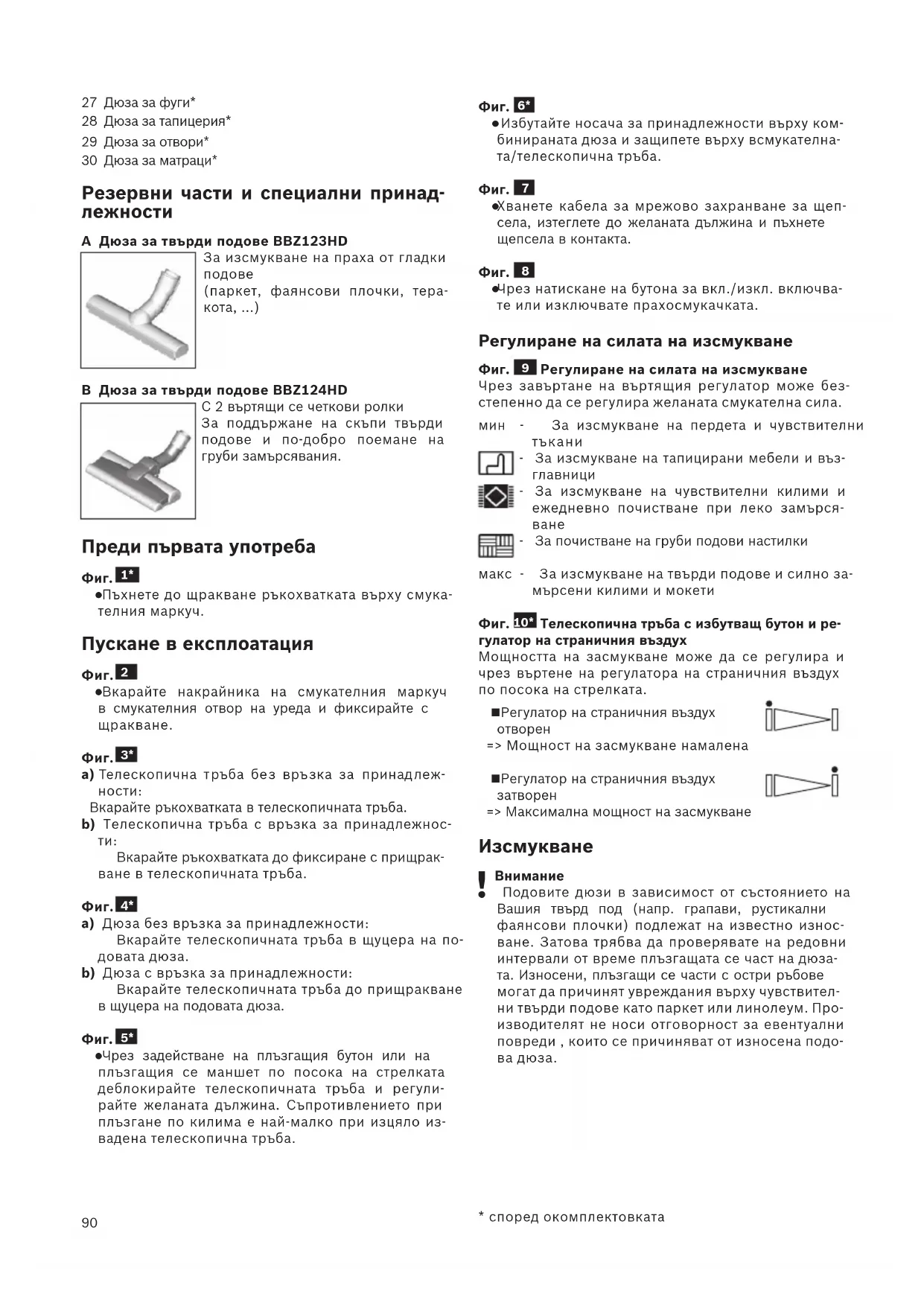 Регулиране на силата на изсмукване Чрез завъртане на въртящия регулатор може без- степенно да се регулира желаната смукателна сила. мин - За изсмукване на пердета и чувствителни