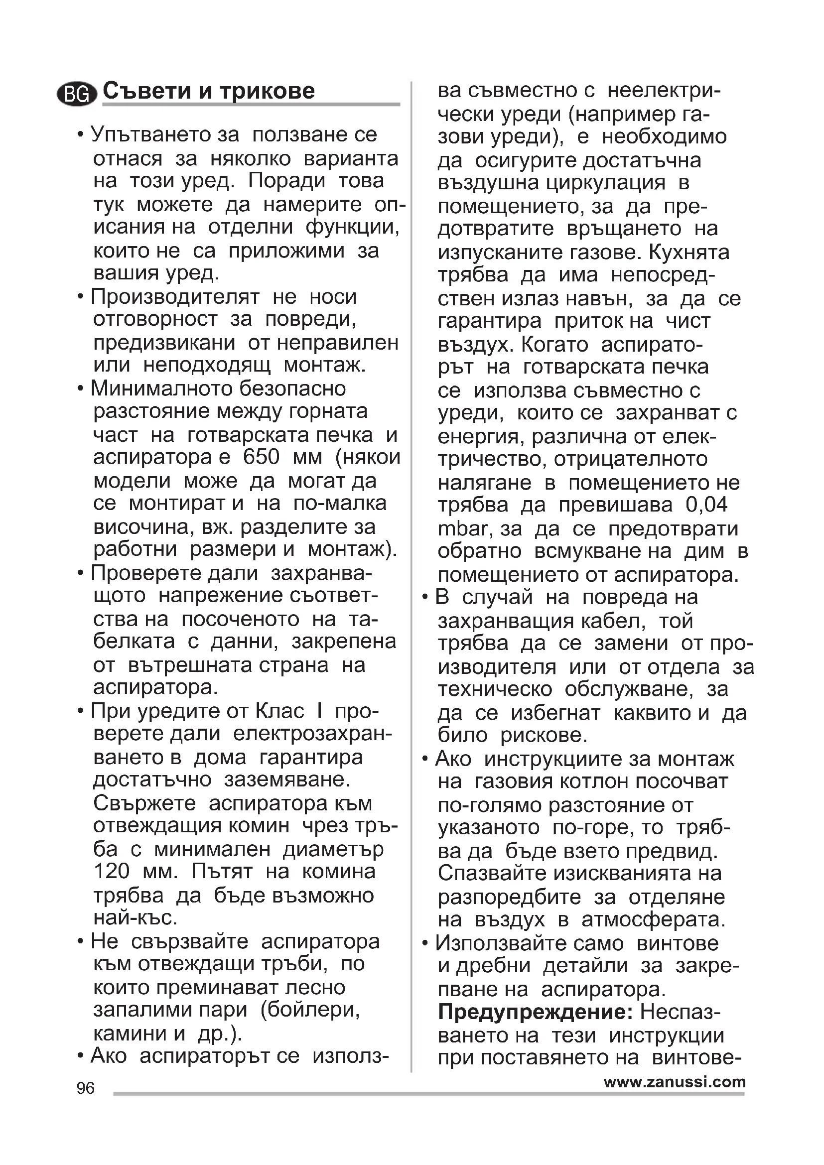 - Използвайте само винтове и дребни детайли за закре- пване на аспиратора. Предупреждение: Неспаз- ването на тези инструкции при поставянето на винтове- BG97 www.zanussi.com те или закрепващото прис- пособление може да доведе до опасност от електрически