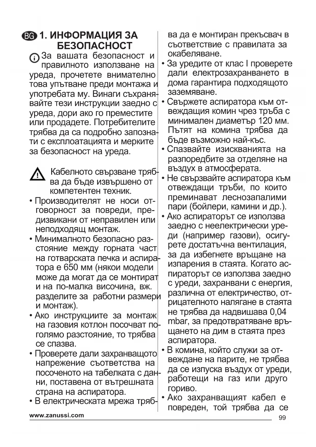 BELGIUM TEL: +32 2 716 26 00 FAX: +32 2 716 26 01 www.electrolux.com KullanımÖmrü Bilgisi: Kullanım ömrü küçük ev aletlerinde 7 yıl, diğer beyaz eşya ürünlerinde ise 10 yıldır. Kullanım ömrü, üretici ve/veya ithalatçı rmanın cihazınızla ilgili yedek parça temini ve bakım süresini ifade eder.99 www.zanussi.com 1.ИНФОРМАЦИЯЗА БЕЗОПАСНОСТ За вашата безопасност и правилното използване на уреда, прочетете внимателно това упътване преди монтажа и употребата му. Винаги съхраня- вайте тези инструкции заедно с уреда, дори ако го преместите или продадете. Потребителите трябва да са подробно запозна- ти с експлоатацията и мерките за безопасност на уреда. Кабелното свързване тряб- ва да бъде извършено от компетентен техник.