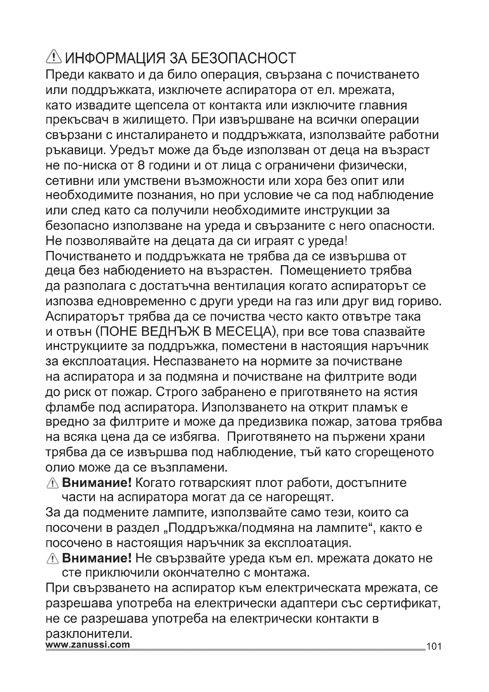 Внимание! Преди каквато и да е операция свързана с почистване или поддръжка изключете аспиратора от ел.мрежата, като извадите щепсела или изключите главния прекъсвач на жилището. Аспираторът трябва да се почиства често (или поне толкова на често колкото почиствате филтрите), както отвътре така и отвън. Използвайте навлажнена кърпа и неутрални течни почистващи препарати. Избягвайте препарати, които съдържат абразивни частици. Внимание ! Не почиствайте никога със спирт ! Внимание! Неспазването на нормите за почистване на аспиратора и за подмяна на филтрите води до рискове от пожар. Спазвайте строго посочените инструкции! Не се поема никаква отговорност за евентуални щети нанесени по мотора и пожари, възникнали следствие на неправилна поддръжка или неспазване на настоящите инструкции. Филтър за мазнини - Почиства се веднъж месечно с неутрални препарати. Мие се ръчно или в съдомиялна машина на ниска температура и кратък режим на измиване. При миене на филтъра за мазнини в съдомиялна машина е възможно той да се обезцвети, но това в никакъв случай не намалява способността му на филтриране. Немиещ се филтър с активен въглен Филтърът с активен въглен се запушва приблизително след дълъг период на използване в зависимост от начина на готвене и от това колко често почиствате филтъра . Във всеки случай е необходимо да подменяте филтъра с активен въглен на всеки четири месеца или когато индикаторът за засищане на филтрите показва, че е необходимо. Не се мие нито може да се използва повторно.104 www.zanussi.com