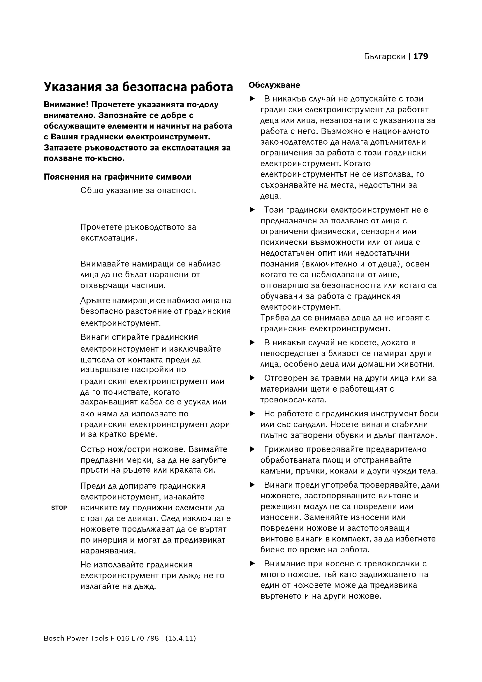 f Този градински електроинструмент не е предназначен за ползване от лица с ограничени физически, сензорни или психически възможности или от лица с недостатъчен опит или недостатъчни познания (включително и от деца), освен когато те са наблюдавани от лице, отговарящо за безопасността или когато са обучавани за работа с градинския електроинструмент. Трябва да се внимава деца да не играят с градинския електроинструмент. f В никакъв случай не косете, докато в непосредствена близост се намират други лица, особено деца или домашни животни. f Отговорен за травми на други лица или за материални щети е работещият с тревокосачката. f Не работете с градинския инструмент боси или със сандали. Носете винаги стабилни плътно затворени обувки и дълъг панталон. f Грижливо проверявайте предварително обработваната площ и отстранявайте камъни, пръчки, кокали и други чужди тела. f Винаги преди употреба проверявайте, дали ножовете, застопоряващите винтове и режещият модул не са повредени или износени. Заменяйте износени или повредени ножове и застопоряващи винтове винаги в комплект, за да избегнете биене по време на работа. f Внимание при косене с тревокосачки с много ножове, тъй като задвижването на един от ножовете може да предизвика въртенето и на други ножове. STOP OBJ_BUCH-1393-001.book Page 179 Friday, April 15, 2011 10:36 AM180 | Български F 016 L70 798 | (15.4.11) Bosch Power Tools f Косете винаги на дневна светлина или при много добро изкуствено осветление. f По възможност не ползвайте градинския инструмент, когато тревата е влажна. f Работете винаги със спокоен ход, никога не ходете бързо. f Работата по неравен терен може да бъде