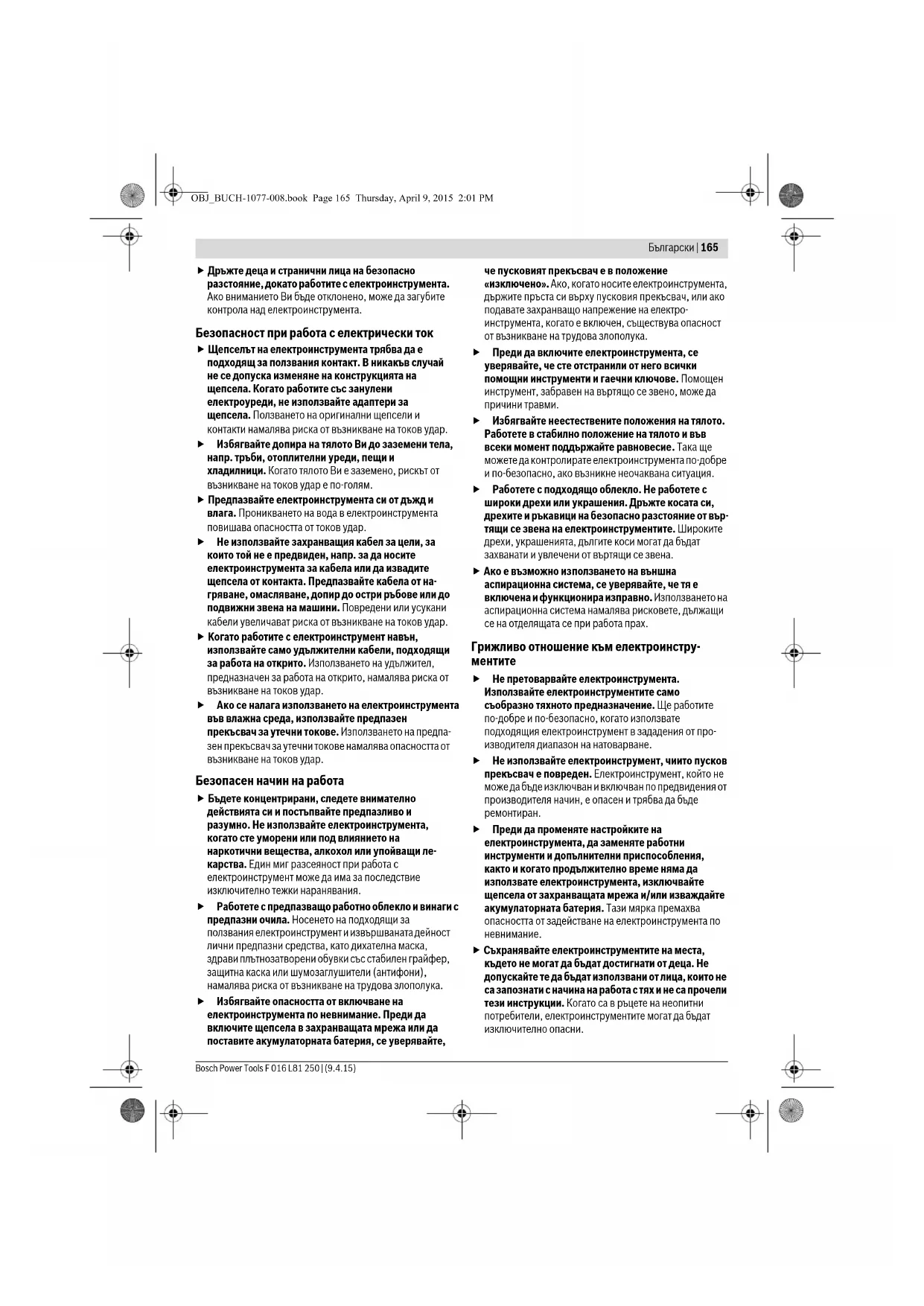 Не работете с електроинструмента в среда с повишена опасност от възникване на експлозия, в близост до леснозапалими течности, газове или прахообразни материали. По време на работа в електроинструментите се отделят искри, които могат да възпламенят прахообразни материали или пари. OBJ_BUCH-1077-008.book Page 164 Thursday, April 9, 2015 2:01 PMБългарски | 165 Bosch Power Tools F 016 L81 250 | (9.4.15) Дръжте деца и странични лица на безопасно разстояние, докато работите с електроинструмента. Ако вниманието Ви бъде отклонено, може да загубите контрола над електроинструмента. Безопасност при работа с електрически ток Щепселът на електроинструмента трябва да е подходящ за ползвания контакт. В никакъв случай не се допуска изменяне на конструкцията на щепсела. Когато работите със занулени електроуреди, не използвайте адаптери за щепсела. Ползването на оригинални щепсели и контакти намалява риска от възникване на токов удар. Избягвайте допира на тялото Ви до заземени тела, напр. тръби, отоплителни уреди, пещи и хладилници. Когато тялото Ви е заземено, рискът от възникване на токов удар е по-голям. Предпазвайте електроинструмента си от дъжд и влага. Проникването на вода в електроинструмента повишава опасността от токов удар. Не използвайте захранващия кабел за цели, за които той не е предвиден, напр. за да носите електроинструмента за кабела или да извадите щепсела от контакта. Предпазвайте кабела от на- гряване, омасляване, допир до остри ръбове или до подвижни звена на машини. Повредени или усукани кабели увеличават риска от възникване на токов удар. Когато работите с електроинструмент навън, използвайте само удължителни кабели, подходящи за работа на открито. Използването на удължител, предназначен за работа на открито, намалява риска от възникване на токов удар. Ако се налага използването на електроинструмента във влажна среда, използвайте предпазен прекъсвач за утечни токове. Използването на предпа- зен прекъсвач за утечни токове намалява опасността от възникване на токов удар. Безопасен начин на работа Бъдете концентрирани, следете внимателно действията си и постъпвайте предпазливо и разумно. Не използвайте електроинструмента, когато сте уморени или под влиянието на наркотични вещества, алкохол или упойващи ле- карства. Един миг разсеяност при работа с електроинструмент може да има за последствие изключително тежки наранявания. Работете с предпазващо работно облекло и винаги с предпазни очила. Носенето на подходящи за ползвания електроинструмент и извършваната дейност лични предпазни средства, като дихателна маска, здрави плътнозатворени обувки със стабилен грайфер, защитна каска или шумозаглушители (антифони), намалява риска от възникване на трудова злополука. Избягвайте опасността от включване на електроинструмента по невнимание. Преди да включите щепсела в захранващата мрежа или да поставите акумулаторната батерия, се уверявайте, че пусковият прекъсвач е в положение «изключено». Ако, когато носите електроинструмента, държите пръста си върху пусковия прекъсвач, или ако подавате захранващо напрежение на електро- инструмента, когато е включен, съществува опасност от възникване на трудова злополука. Преди да включите електроинструмента, се уверявайте, че сте отстранили от него всички помощни инструменти и гаечни ключове. Помощен инструмент, забравен на въ