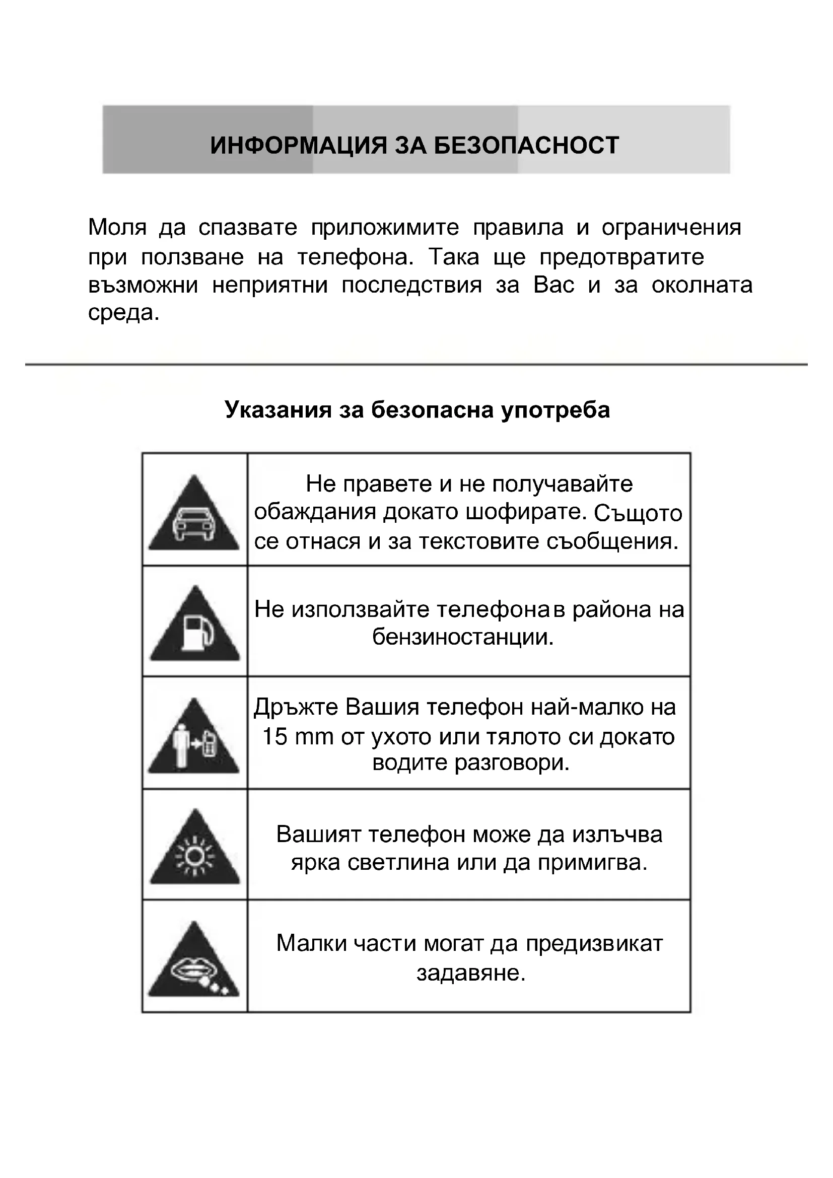 Моля да спазвате приложимите правила и ограничения при ползване на телефона. Така ще предотвратите възможни неприятни последствия за Вас и за околната