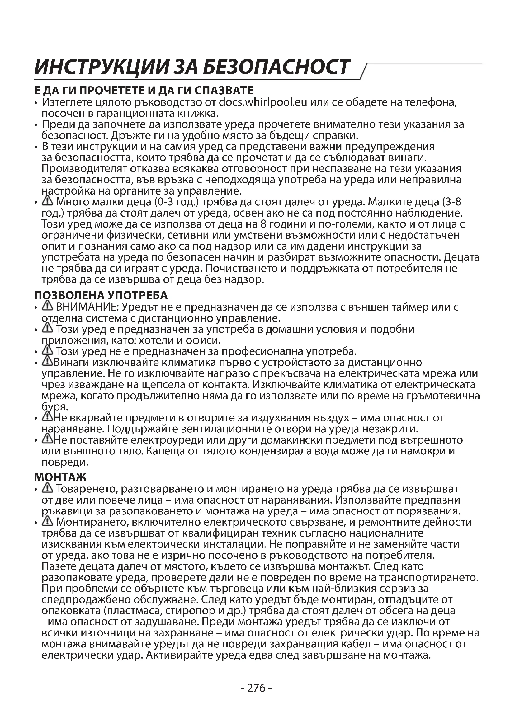 Монтирането, включ ително електрическото свързване, и ремонтните дейности трябва да се извършват от квалифициран техник съгласно националните изисквания към електрически инсталации. Не поправяйте и не заменяйте части от уреда, ако това не е изрично посочено в ръководството на потребителя. Пазете децата далеч от мястото, където се извършва монтажът. След като разопаковате уреда, проверете дали не е повреден по време на транспортирането. При проблеми се обърнете към търговеца или към най-близкия сервиз за следпродажбено обслужване. След като уредът бъде монтиран, отпадъците от опаковката (пластмаса, стиропор и др.) трябва да стоят далеч от обсега на деца - има опасност от задушаване. Преди монтажа уредът трябва да се изключи от всички източници на захранване – има опасност от електрически удар. По време на монтажа внимавайте уредът да не повреди захранващия кабел – има опасност от електрически удар. Активирайте уреда едва след завършване на монтажа. ИНСТРУКЦИИ ЗА БЕЗОПАСНОСТ- 277 -