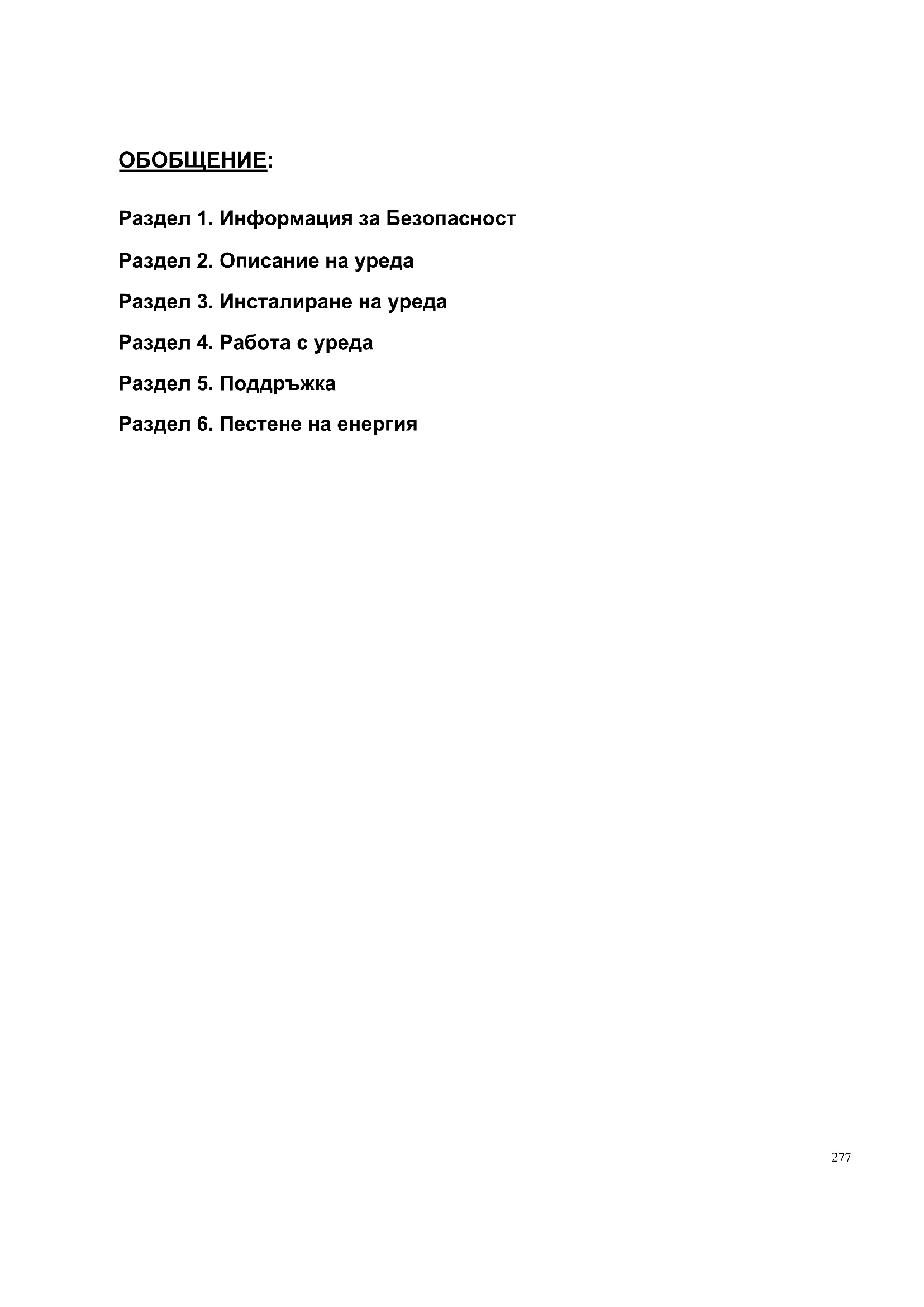 Раздел 1. Информация за Безопасност Раздел 2. Описание на уреда Раздел 3. Инсталиране на уреда Раздел 4. Работа с уреда Раздел 5. Поддръжка Раздел 6. Пестене на енергия278 Благодарим Ви, че закупихте този продукт. Преди да използвате вашия хладилен уред, моля внимателно прочетете това ръководство с инструкции, за да постигнете най-добра ефективност. Съхранявайте цялата документация за последващо ползване или за други собственици. Този продукт е предназначен единствено за домашна употреба или за подобни приложения като: кухненски бокс за персонала в магазини, офиси и друга работна среда във ферми, от клиенти на хотели, мотели и в друга среда от жилищен тип в семейни хотели тип “bed and breakfast” (B & B) за кетъринг услуги и подобни приложения, но не и като оборудване на обекти за продажби на дребно. Този уред трябва да бъде използван само за съхранение на храна, всяка друга употреба се счита за опасна и производителят няма да бъде отговорен за каквито и да е пропуски. Препоръчително е също да запознаете с условията на гаранцията. За да постигнете възможно най-добра ефективност и безпроблемно функциониране на уреда ви, е много важно да прочетете внимателно тези инструкции. Неспазването на тези инструкции може да ви лиши от правото на безплатно обслужване по време на гаранционния период.279 Раздел 1.ИНФОРМАЦИЯ ЗА БЕЗОПАСНОСТ Това ръководство съдържа много важна информация за безопасност. Препоръчваме Ви да съхранявате тези инструкции на безопасно място за лесна справка и добра работа с уреда. Хладилният уред съдържа хладилен газ (R600a: изобутан) и изолационен газ (циклопентан), с висока съвместимост с околната среда, които, обаче, са запалими. Внимание: опасност от пожар Ако охладителната верига се повреди: Избягвайте открит огън и източници на запалване. Грижливо проветрете стаята, в която се намира уредът. Процент време на работа:18 ПРЕДУПРЕЖДЕНИЕ! Бъдете внимателни при почистването/пренасянето на уреда и избягвайте да докосвате металните жици на компресора в задния край на уреда, тъй като може да нараните пръстите и ръцете си или да повредите вашия продукт.