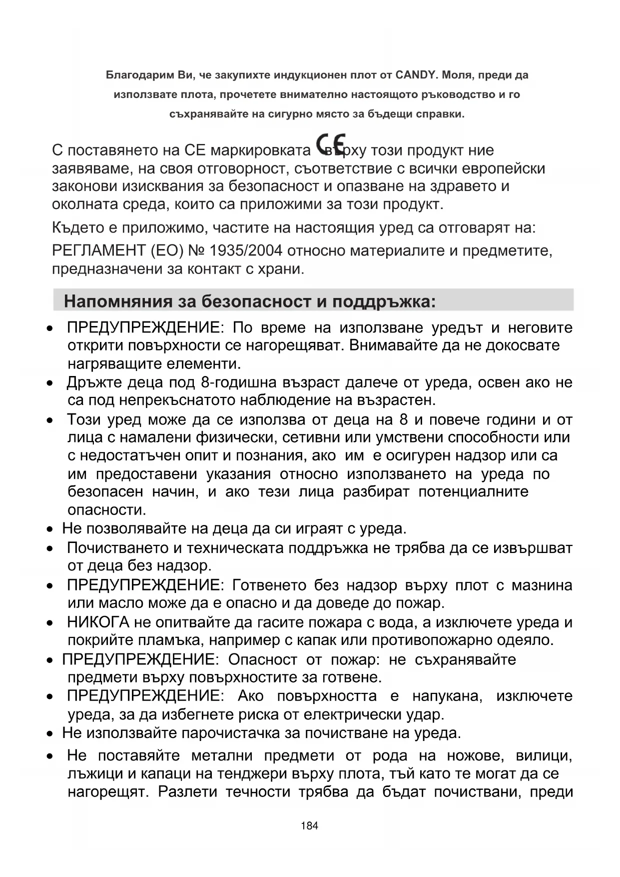 - ПРЕДУПРЕЖДЕНИЕ: Използвайте само предпазители за плотове, които са проектирани от производителя на уреда за готвене или са посочени като подходящи от него в указанията за употреба, или вградените в уреда предпазители за плота. Използването на неподходящи предпазители може да доведе до злополуки. - Винаги използвайте подходящи готварски съдове. - Винаги поставяйте съда в центъра на котлона, на който готвите. - Не поставяйте нищо върху панела за управление. - Не използвайте повърхността като дъска за рязане. - В окабеляването трябва да бъде вградено средство за изключване, съгласно правилата за изграждане на електрически инсталации. - Указанията посочват типа захранващ кабел, който се използва, като е взета предвид температурата на задната повърхност на уреда. - Преди да затворите капака, трябва да оставите повърхността на плота да изстине. - ВНИМАНИЕ: Не гответе, без наблюдавате процеса. Ако готвенето продължава кратко време, наблюдавайте процеса непрекъснато.186 Уважаеми клиенти, Благодарим Ви, че закупихте индукционен плот от CANDY. Надяваме се той да Ви служи безпроблемно дълги години. Моля, преди да използвате плота, прочетете внимателно настоящото ръководство и го съхранявайте на сигурно място за бъдещи справки. Представяне на продукта Благодарение на електромагнитните си зони за готвене, микрокомпютърното си управление и разнообразните си функции индукционният плот е подходящ за всички начини на готвене, което го прави идеалният избор за едно съвременно семейство. Произведен от специално внесени за целта материали, индукционният плот на CANDY е изключително лесен за ползване, устойчив и безопасен. Принцип на работа