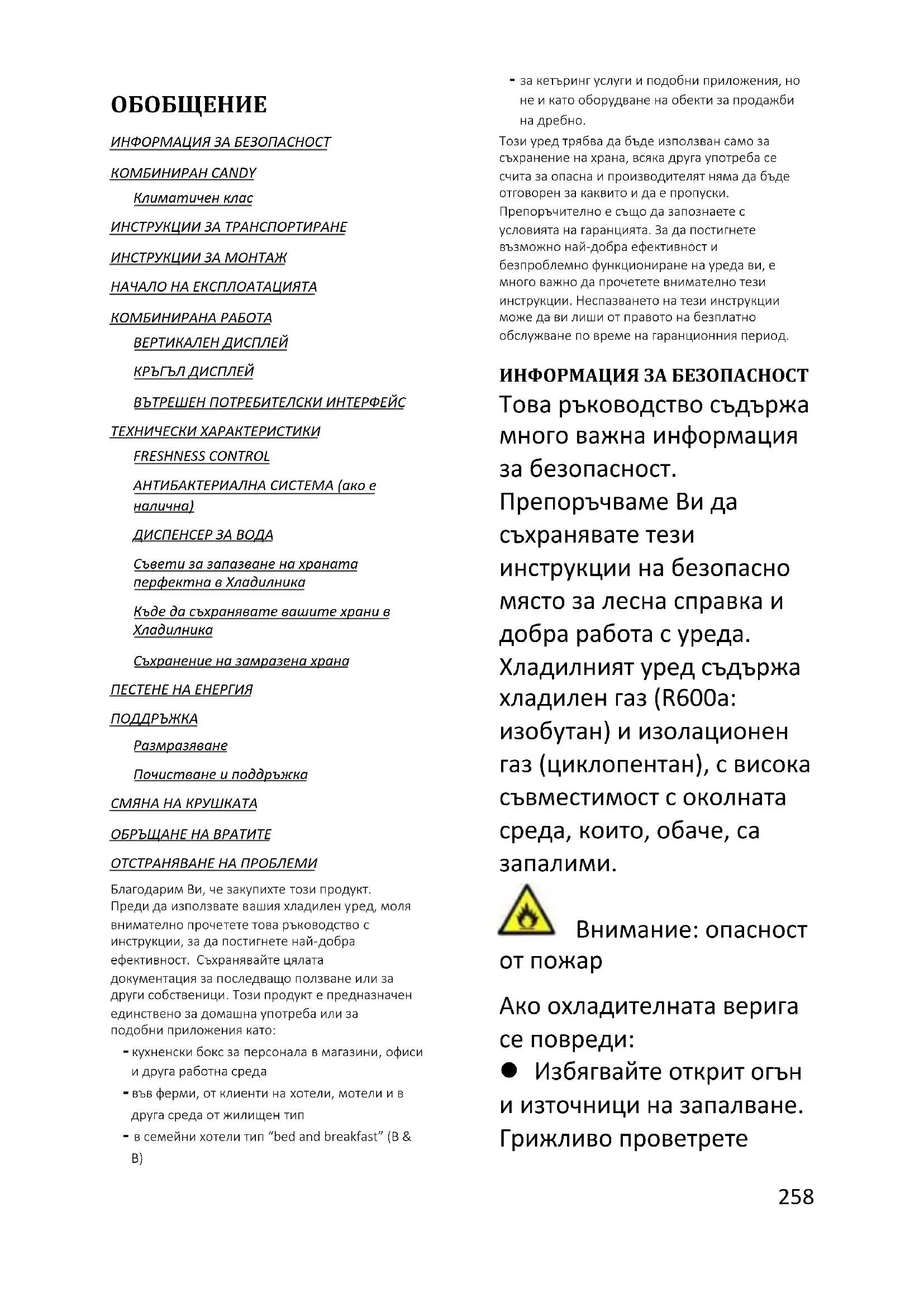 ИНФОРМАЦИЯ ЗА БЕЗОПАСНОСТ КОМБИНИРАН CANDY Климатичен клас ИНСТРУКЦИИ ЗА ТРАНСПОРТИРАНЕ ИНСТРУКЦИИ ЗА МОНТАЖ НАЧАЛО НА ЕКСПЛОАТАЦИЯТА КОМБИНИРАНА РАБОТА ВЕРТИКАЛЕН ДИСПЛЕЙ КРЪГЪЛ ДИСПЛЕЙ ВЪТРЕШЕН ПОТРЕБИТЕЛСКИ ИНТЕРФЕЙС ТЕХНИЧЕСКИ ХАРАКТЕРИСТИКИ FRESHNESS CONTROL АНТИБАКТЕРИАЛНА СИСТЕМА (ако е налична) ДИСПЕНСЕР ЗА ВОДА Съвети за запазване на храната перфектна в Хладилника Къде да съхранявате вашите храни в Хладилника Съхранение на замразена храна ПЕСТЕНЕ НА ЕНЕРГИЯ ПОДДРЪЖКА Размразяване Почистване и поддръжка СМЯНА НА КРУШКАТА ОБРЪЩАНЕ НА ВРАТИТЕ ОТСТРАНЯВАНЕ НА ПРОБЛЕМИ Благодарим Ви, че закупихте този продукт. Преди да използвате вашия хладилен уред, моля внимателно прочетете това ръководство с инструкции, за да постигнете най-добра ефективност. Съхранявайте цялата документация за последващо ползване или за други собственици. Този продукт е предназначен единствено за домашна употреба или за подобни приложения като: - кухненски бокс за персонала в магазини, офиси и друга работна среда - във ферми, от клиенти на хотели, мотели и в друга среда от жилищен тип - в семейни хотели тип “bed and breakfast” (B & B) - за кетъринг услуги и подобни приложения, но не и като оборудване на обекти за продажби на дребно. Този уред трябва да бъде използван само за съхранение на храна, всяка друга употреба се счита за опасна и производителят няма да бъде отговорен за каквито и да е пропуски. Препоръчително е също да запознаете с условията на гаранцията. За да постигнете възможно най-добра ефективност и безпроблемно функциониране на уреда ви, е много важно да прочетете внимателно тези инструкции. Неспазването на тези инструкции може да ви лиши от правото на безплатно обслужване по време на гаранционния период. ИНФОРМАЦИЯ ЗА БЕЗОПАСНОСТ Това ръководство съдържа много важна информация за безопасност. Препоръчваме Ви да съхранявате тези инструкции на безопасно място за лесна справка и добра работа с уреда. Хладилният уред съдържа хладилен газ (R600a: изобутан) и изолационен газ (циклопентан), с висока съвместимост с околната среда, които, обаче, са