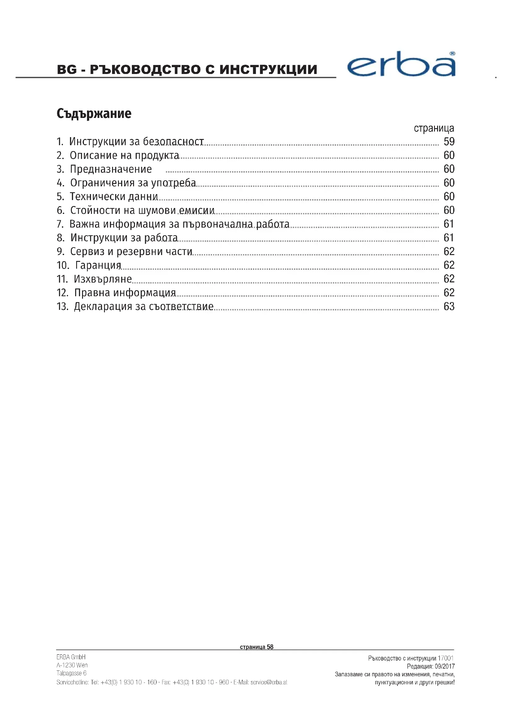 РЪКОВОДСТВО ЗА ПОТРЕБИТЕЛЯ 17001 Erba
