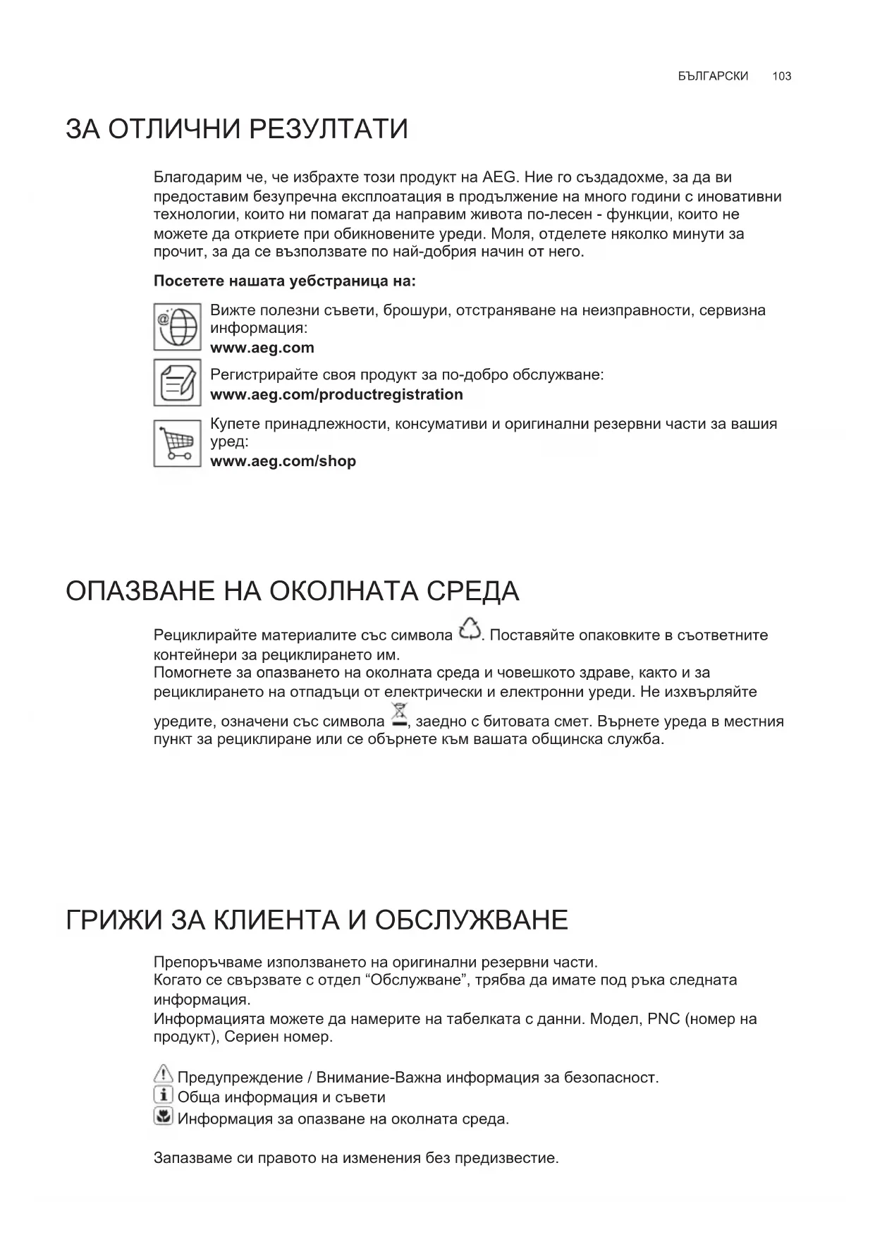 ЗА ОТЛИЧНИ РЕЗУЛТАТИ Благодарим че, че избрахте този продукт на AEG. Ние го създадохме, за да ви предоставим безупречна експлоатация в продължение на много години с иновативни технологии, които ни помагат да направим живота по-лесен - функции, които не можете да откриете при обикновените уреди. Моля, отделете няколко минути за прочит, за да се възползвате по най-добрия начин от него. Посетете нашата уебстраница на: Вижте полезни съвети, брошури, отстраняване на неизправности, сервизна информация: www.aeg.com Регистрирайте своя продукт за по-добро обслужване: www.aeg.com/productregistration Купете принадлежности, консумативи и оригинални резервни части за вашия