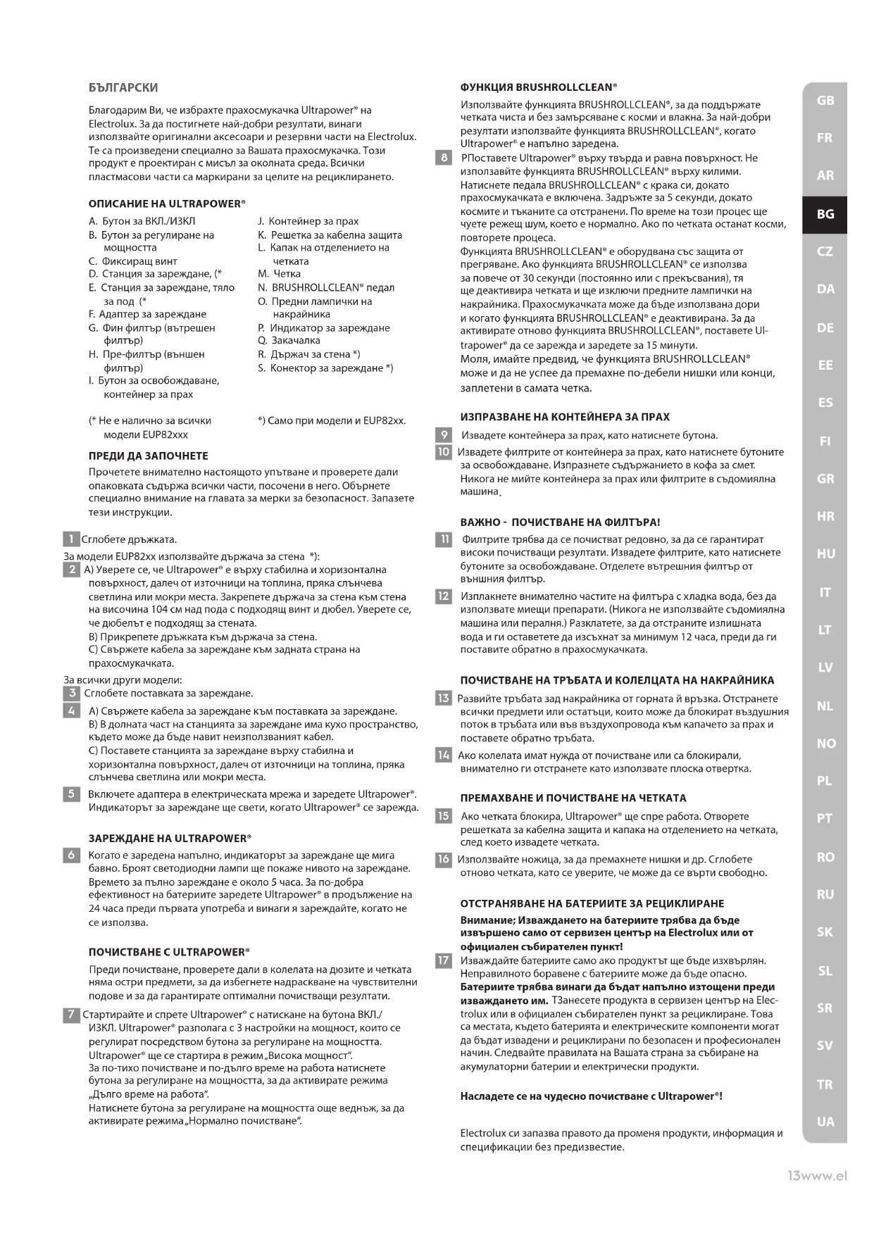 P. Индикатор за зареждане Q. Закачалка R. Държач за стена *) S. Kонектор за зареждане *) *) Само при модели и EUP82xx. ПРЕДИ ДА ЗАПОЧНЕТЕ Прочетете внимателно настоящото упътване и проверете дали опаковката съдържа всички части, посочени в него. Обърнете специално внимание на главата за мерки за безопасност. Запазете тези инструкции. 1 Сглобете дръжката. За модели EUP82xx използвайте държача за стена *): 2 A) Уверете се, че Ultrapower® е върху стабилна и хоризонтална повърхност, далеч от източници на топлина, пряка слънчева светлина или мокри места. Закрепете държача за стена към стена на височина 104 см над пода с подходящ винт и дюбел. Уверете се, че дюбелът е подходящ за стената. B) Прикрепете дръжката към държача за стена. C) Свържете кабела за зареждане към задната страна на прахосмукачката. За всички други модели: 3 Сглобете поставката за зареждане. 4 A) Свържете кабела за зареждане към поставката за зареждане. B) В долната част на станцията за зареждане има кухо пространство, където може да бъде навит неизползваният кабел. C) Поставете станцията за зареждане върху стабилна и хоризонтална повърхност, далеч от източници на топлина, пряка слънчева светлина или мокри места. 5 Включете адаптера в електрическата мрежа и заредете Ultrapower®. Индикаторът за зареждане ще свети, когато Ultrapower® се зарежда. ЗАРЕЖДАНЕ НА ULTRAPOWER® 6 Когато е заредена напълно, индикаторът за зареждане ще мига бавно. Броят светодиодни лампи ще покаже нивото на зареждане. Времето за пълно зареждане е около 5 часа. За по-добра ефективност на батериите заредете Ultrapower® в продължение на 24 часа преди първата употреба и винаги я зареждайте, когато не се използва. ПОЧИСТВАНЕ С ULTRAPOWER® Преди почистване, проверете дали в колелата на дюзите и четката няма остри предмети, за да избегнете надраскване на чувствителни подове и за да гарантирате оптимални почистващи резултати. 7 Стартирайте и спрете Ultrapower® с натискане на бутона ВКЛ./ ИЗКЛ. Ultrapower® разполага с 3 настройки на мощност, които се регулират посредством бутона за регулиране на мощността. Ultrapower® ще се стартира в режим „Висока мощност“. За по-тихо почистване и по-дълго време на работа натиснете бутона за регулиране на мощността, за да активирате режима „Дълго време на работа“. Натиснете бутона за регулиране на мощността още веднъж, за да активирате режима „Нормално почистване“. ФУНКЦИЯ BRUSHROLLCLEAN® Използвайте функцията BRUSHROLLCLEAN®, за да поддържате четката чиста и без замърсяване с косми и влакна. За най-добри резултати използвайте функцията BRUSHROLLCLEAN®, когато Ultrapower® е напълно заредена. 8 PПоставете Ultrapower® върху твърда и равна повърхност. Не използавйте функцията BRUSHROLLCLEAN® върху килими. Натиснете педала BRUSHROLLCLEAN® с крака си, докато прахосмукачката е включена. Задръжте за 5 секунди, докато космите и тъканите са отстранени. По време на този процес ще чуете режещ шум, което е нормално. Ако по четката останат косми, повторете процеса. Функцията BRUSHROLLCLEAN® е оборудвана със защита от прегряване. Ако функцията BRUSHROLLCLEAN® се използва за повече от 30 секунди (постоянно или с прекъсвания), тя ще деактивира четката и ще изключи предните лампички на накрайника. Прахосмукачката може да бъде използвана дори и когато функцията BRUSHROLLCLEAN® е деактивирана. За да активирате отново функцията BRUSHROLLCLEAN®, поставете Ul- trapower® да се зарежда и заредете за 15 минути. Моля, имайте предвид, че функци
