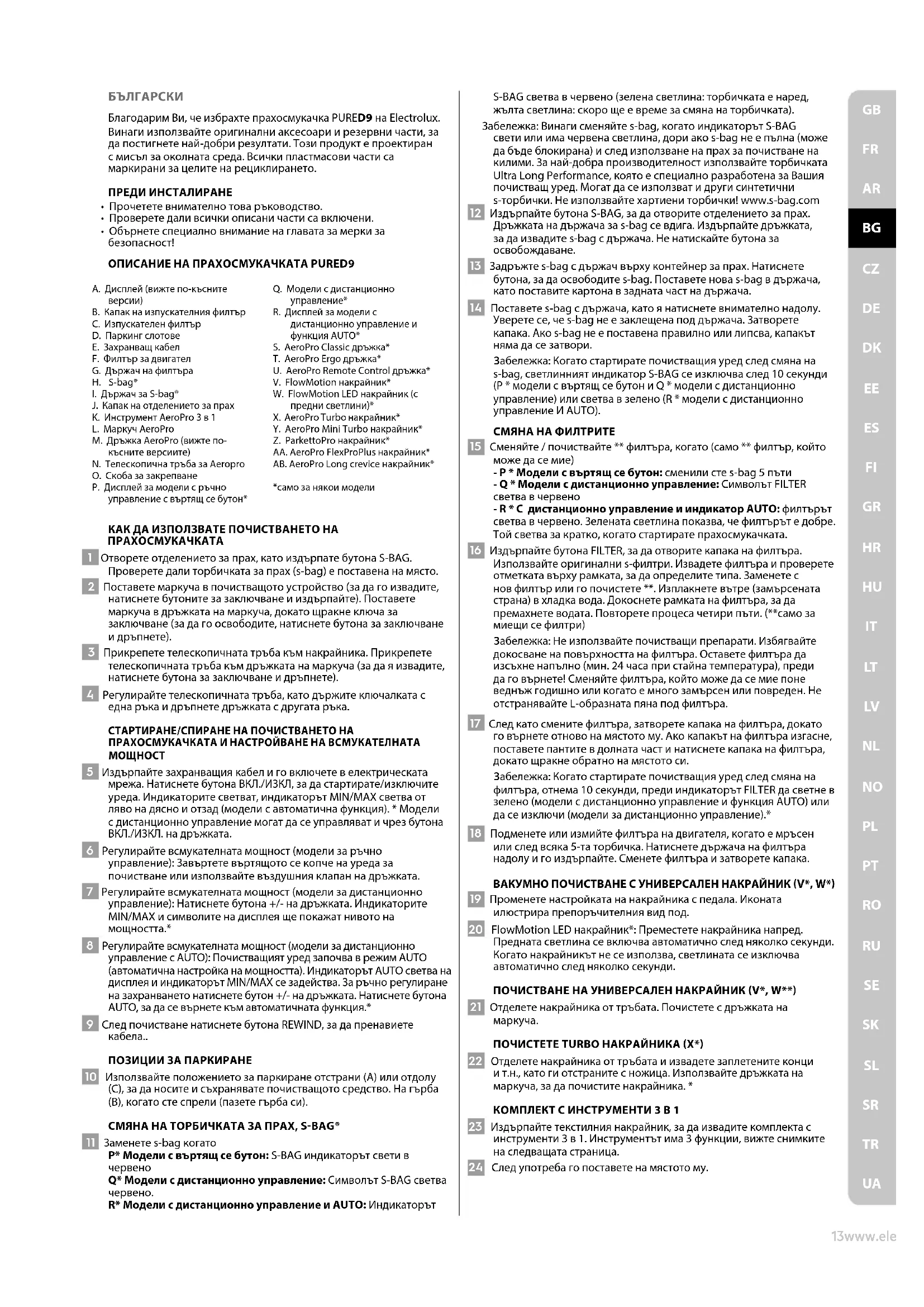 Благодарим Ви, че избрахте прахосмукачка PURED9 на Electrolux. Винаги използвайте оригинални аксесоари и резервни части, за да постигнете най-добри резултати. Този продукт е проектиран с мисъл за околната среда. Всички пластмасови части са маркирани за целите на рециклирането.