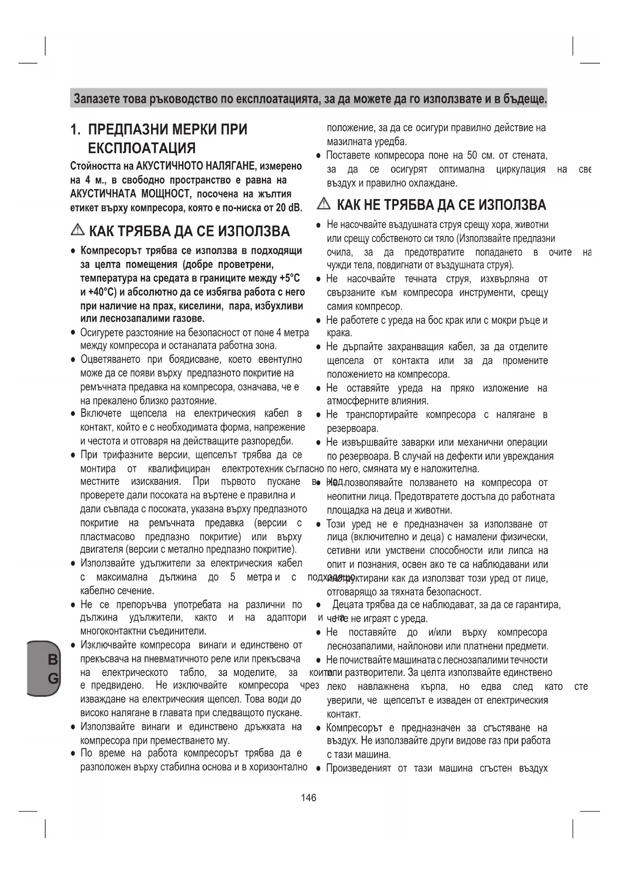 не може да се използва във фармацевтичната, хранително-вкусовата област и в болничните структури, освен, ако предварително не бъде обработен, освен това, не е предназначен за пълнененаводолазнибутилки. ● Не работете с компресора, ако не е обезопасен (предпазно покритиенаремъчнатапредавка) и не пипайтедвижещитесечасти.