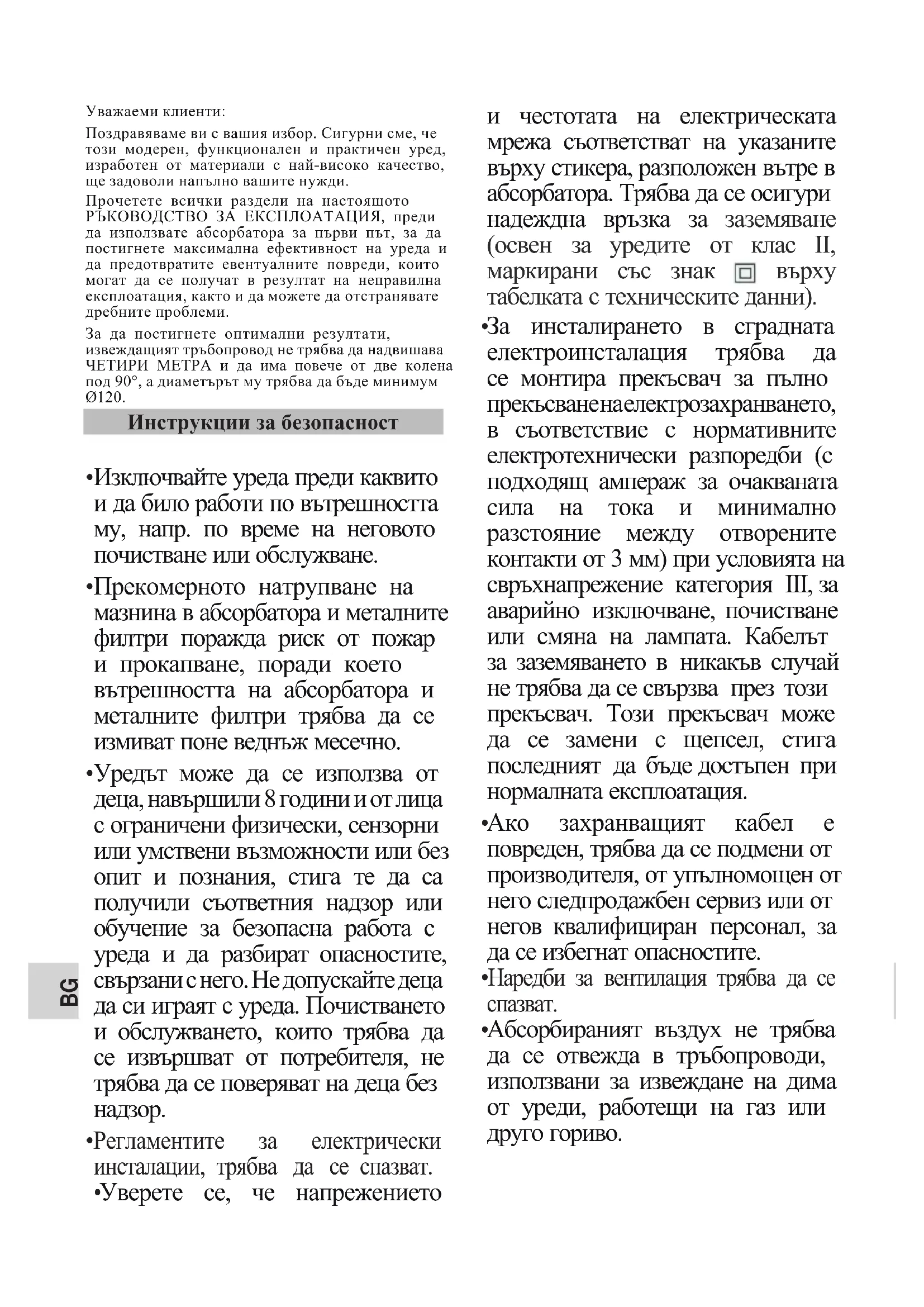 Абсорбираният въздух не трябва да се отвежда в тръбопроводи, използвани за извеждане на дима от уреди, работещи на газ или друго гориво. Инструкции за безопасностBG