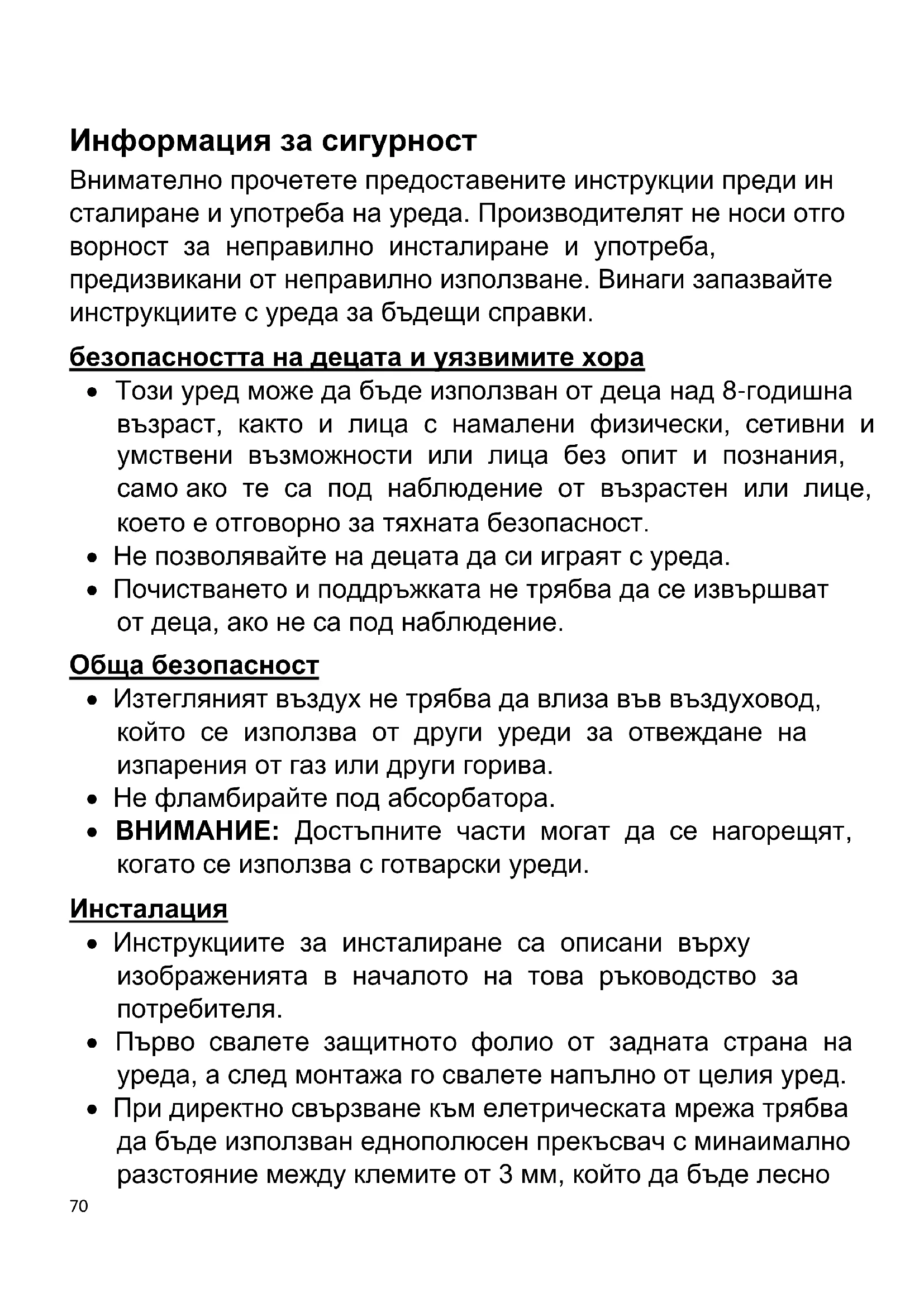 - При директно свързване към елетрическата мрежа трябва да бъде използван еднополюсен прекъсвач с минаимално разстояние между клемите от 3 мм, който да бъде лесно71