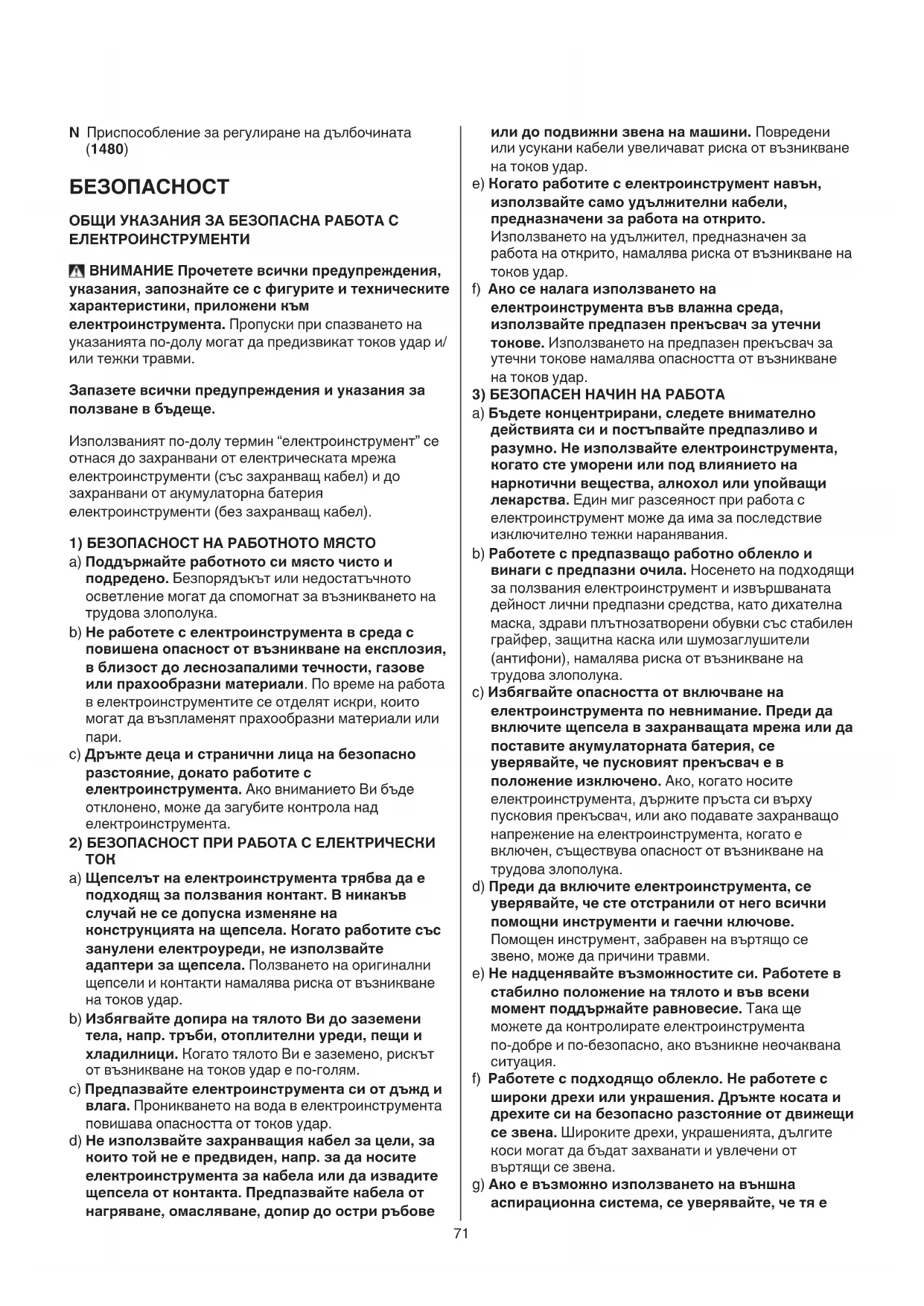 - Прочетете и пазете това ръководство за работа 4 ТЕXHИЧЕСКИ ДАННИ 1 ЕЛЕМЕНТИ НА ИНСТРУМЕНТА 2 A Шестостенен ключ B Място за съхранение на шестостенния ключ C Затягащ винт с шайба D Шлифовъчна плоча E Шлифовъчен лист F Помощна ръчка (1480) G Приспособление за изсмукване на праха H Прекъсвач за включване/изключване J Диск за избор на скорост K Вентилационните отвоpи L Сегментиран режещ диск M Лист за вибрационно рязане (за дърво, 20 мм)71 N Приспособление за регулиране на дълбочината (1480) БЕЗОПАСНОСТ ОБЩИ УКАЗАНИЯ ЗА БЕЗОПАСНА РАБОТА С ЕЛЕКТРОИНСТРУМЕНТИ ВНИМАНИЕ Прочетете всички предупреждения, указания, запознайте се с фигурите и техническите характеристики, приложени към електроинструмента. Пропуски при спазването на указанията по-долу могат да предизвикат токов удар и/ или тежки травми. Запазете всички предупреждения и указания за ползване в бъдеще. Използваният по-долу термин “електроинструмент” се отнася до захранвани от електрическата мрежа електроинструменти (със захранващ кабел) и до захранвани от акумулаторна батерия електроинструменти (без захранващ кабел).