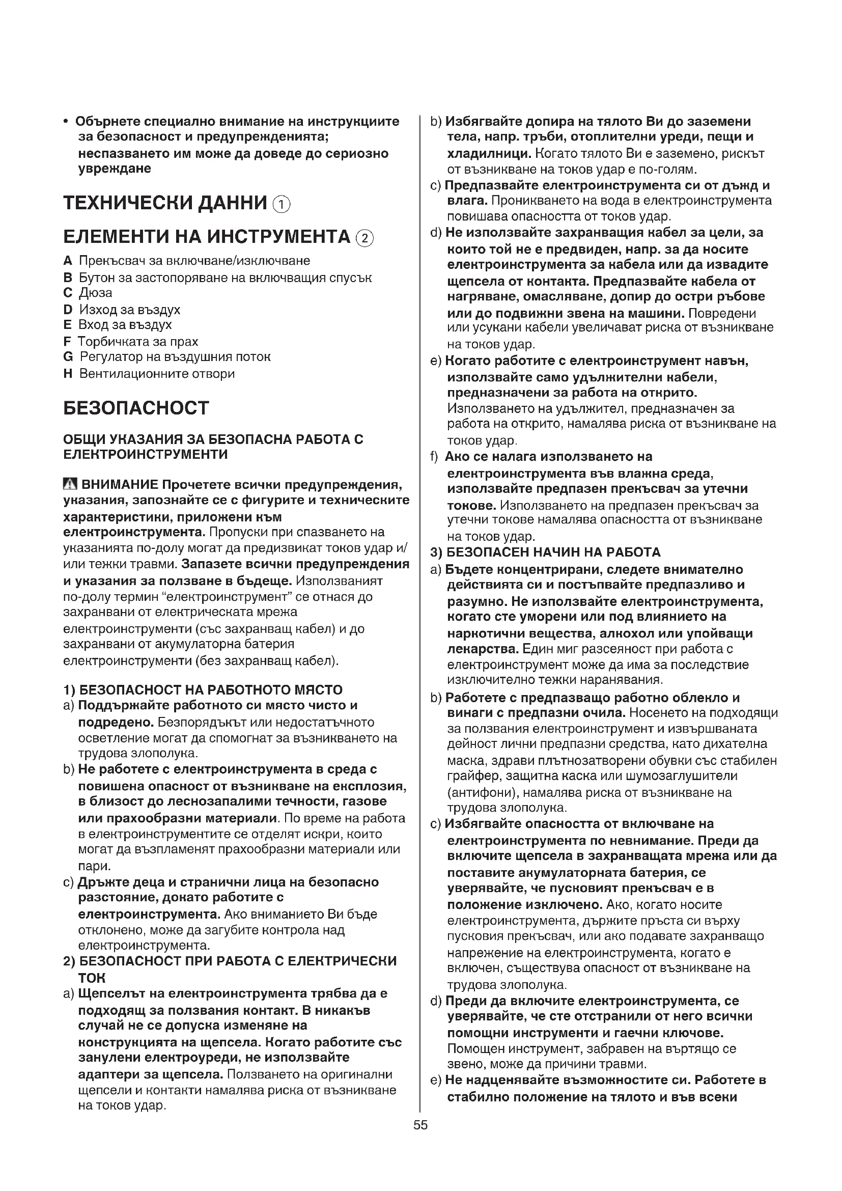 - Не издухвайте и не изсмуквайте на материали, които са опасни за човешкото здраве (като прах от бук и дъб, прах от мазилка, азбест)