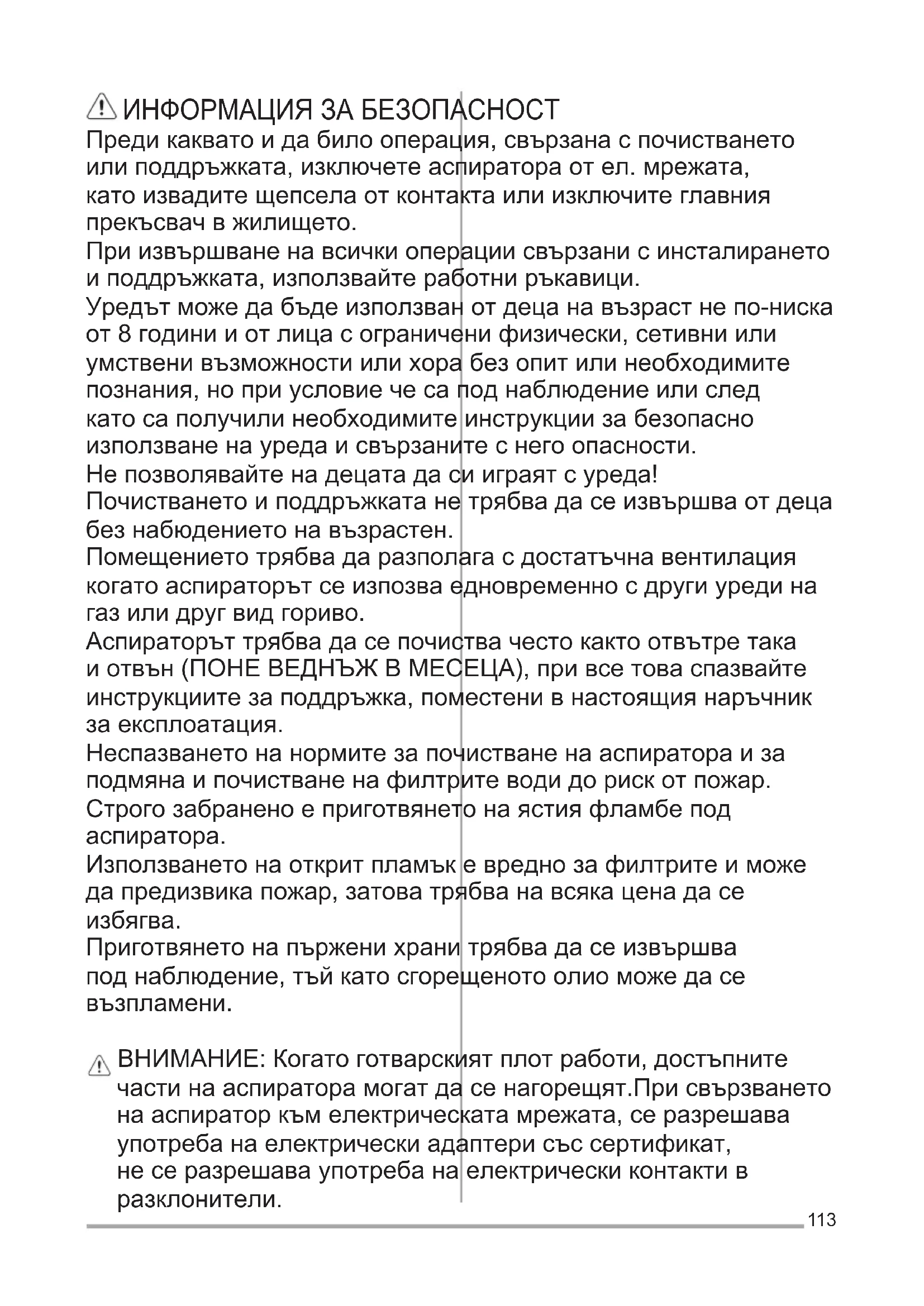 maksimum (5.). IŞIKLANDIRMA DavlumbazLEDteknolojisinedayalıbir aydınlatmasisteminesahiptir. LED’leridealbiraydınlatmavenormal lambalarınkinegöre10defadahauzunbir kullanımsüresive%90enerjitasarrufusağlarlar. Dikkat!Ledışığınadoğrudanbakmayınız. Bunlarınyenileriiledeğiştirilmesiiçinteknik servisebaşvurunuz.113 ИНФОРМАЦИЯЗАБЕЗОПАСНОСТ Предикакватоидабилооперация,свързанаспочистването илиподдръжката,изключетеаспиратораотел.мрежата, катоизвадитещепселаотконтактаилиизключитеглавния прекъсвачвжилището. Приизвършваненавсичкиоперациисвързанисинсталирането иподдръжката,използвайтеработниръкавици. Уредътможедабъдеизползванотдецанавъзрастнепо-ниска от8годинииотлицасограниченифизически,сетивниили умственивъзможностиилихорабезопитилинеобходимите познания,ноприусловиечесаподнаблюдениеилислед катосаполучилинеобходимитеинструкциизабезопасно използваненауредаисвързанитеснегоопасности. Непозволявайтенадецатадасииграятсуреда! Почистванетоиподдръжкатанетрябвадасеизвършваотдеца безнабюдениетонавъзрастен. Помещениетотрябвадаразполагасдостатъчнавентилация когатоаспираторътсеизпозваедновременносдругиуредина газилидругвидгориво. Аспираторъттрябвадасепочиствачестокактоотвътретака иотвън(ПОНЕВЕДНЪЖВМЕСЕЦА),привсетоваспазвайте инструкциитезаподдръжка,поместенивнастоящиянаръчник заексплоатация. Неспазванетонанормитезапочистваненааспиратораиза подмянаипочистваненафилтритеводидорискотпожар. Строгозабраненоеприготвянетонаястияфламбепод аспиратора. Използванетонаоткритпламъкевреднозафилтритеиможе дапредизвикапожар,затоватрябванавсякаценадасе
