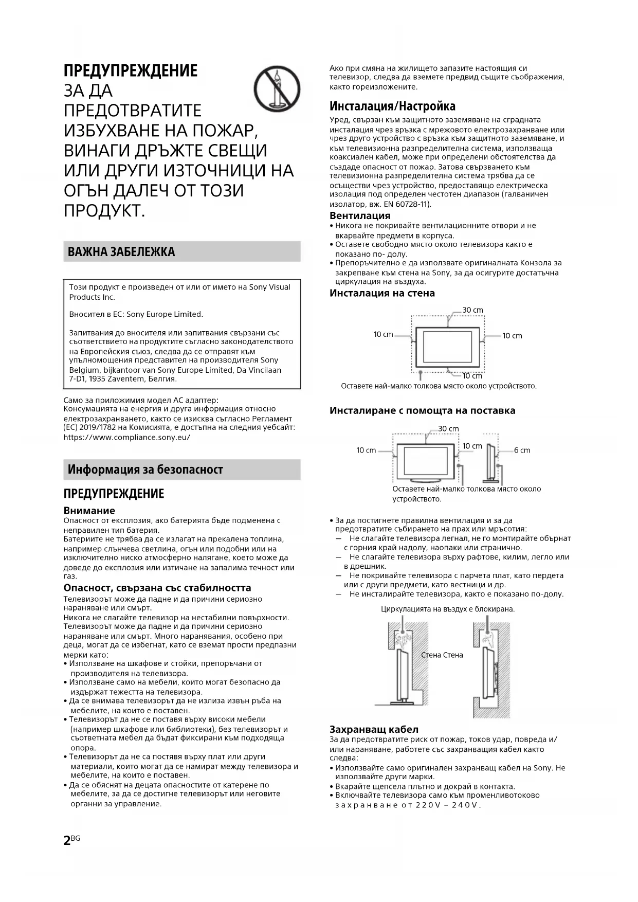 - Включвайте телевизора само към променливотоково захранване от 220V – 240V. Този продукт е произведен от или от името на Sony Visual Products Inc. Вносител в ЕС: Sony Europe Limited. Запитвания до вносителя или запитвания свързани със съответствието на продуктите съгласно законодателството на Европейския съюз, следва да се отправят към упълномощения представител на производителя Sony Belgium, bijkantoor van Sony Europe Limited, Da Vincilaan 7-D1, 1935 Zaventem, Белгия. 30 cm 10 cm 10 cm Оставете най-малко толкова място около устройството. 10 cm Оставете най-малко толкова място около устройството. 30 cm 10 cm 10 cm 6 cm Циркулацията на въздух е блокирана. Стена СтенаC:\Users\CHAILING_2\Desktop\4746858131\4746858131_17BG.fm master page: Right