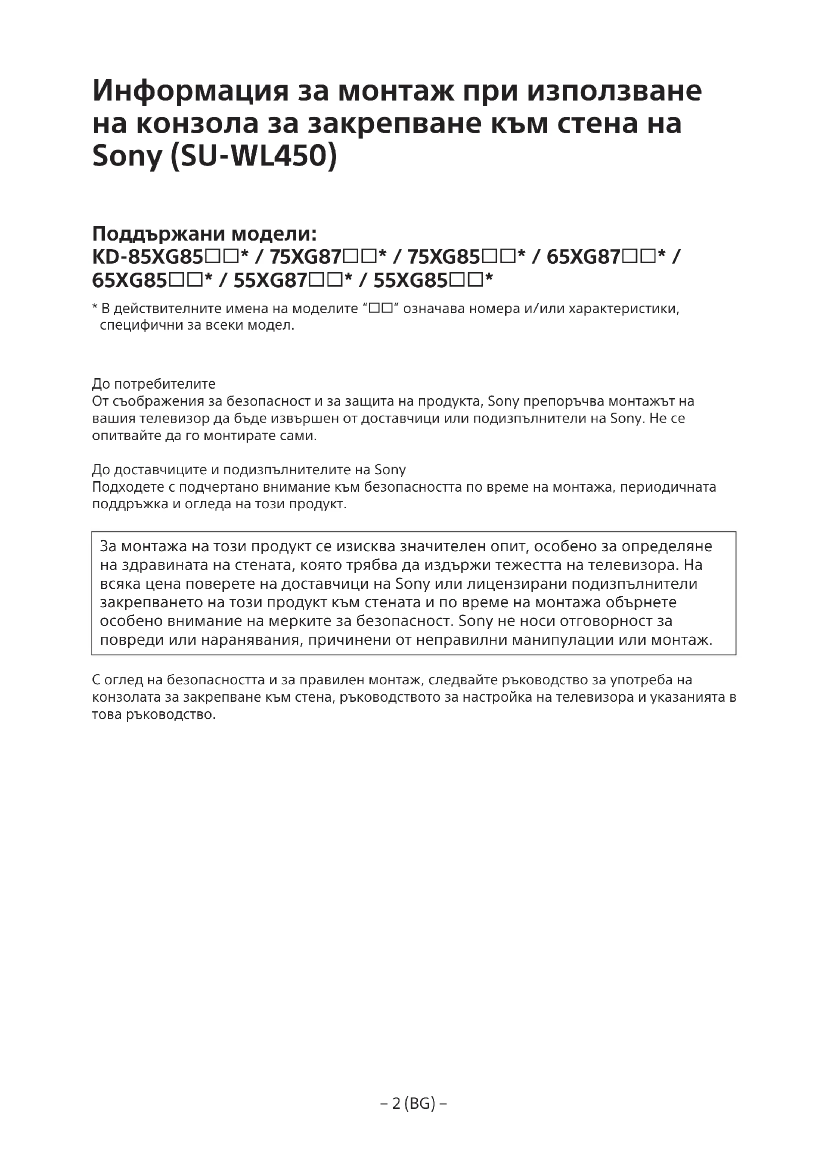 - В действителните имена на моделите “” означава номера и/или характеристики, специфични за всеки модел. До потребителите От съображения за безопасност и за защита на продукта, Sony препоръчва монтажът на вашия телевизор да бъде извършен от доставчици или подизпълнители на Sony. Не се опитвайте да го монтирате сами. До доставчиците и подизпълнителите на Sony Подходете с подчертано внимание към безопасността по време на монтажа, периодичната поддръжка и огледа на този продукт. За монтажа на този продукт се изисква значителен опит, особено за определяне на здравината на стената, която трябва да издържи тежестта на телевизора. На всяка цена поверете на доставчици на Sony или лицензирани подизпълнители закрепването на този продукт към стената и по време на монтажа обърнете особено внимание на мерките за безопасност. Sony не носи отговорност за повреди или наранявания, причинени от неправилни манипулации или монтаж. С оглед на безопасността и за правилен монтаж, следвайте ръководство за употреба на конзолата за закрепване към стена, ръководството за настройка на телевизора и указанията в това ръководство.− 3 (BG) −