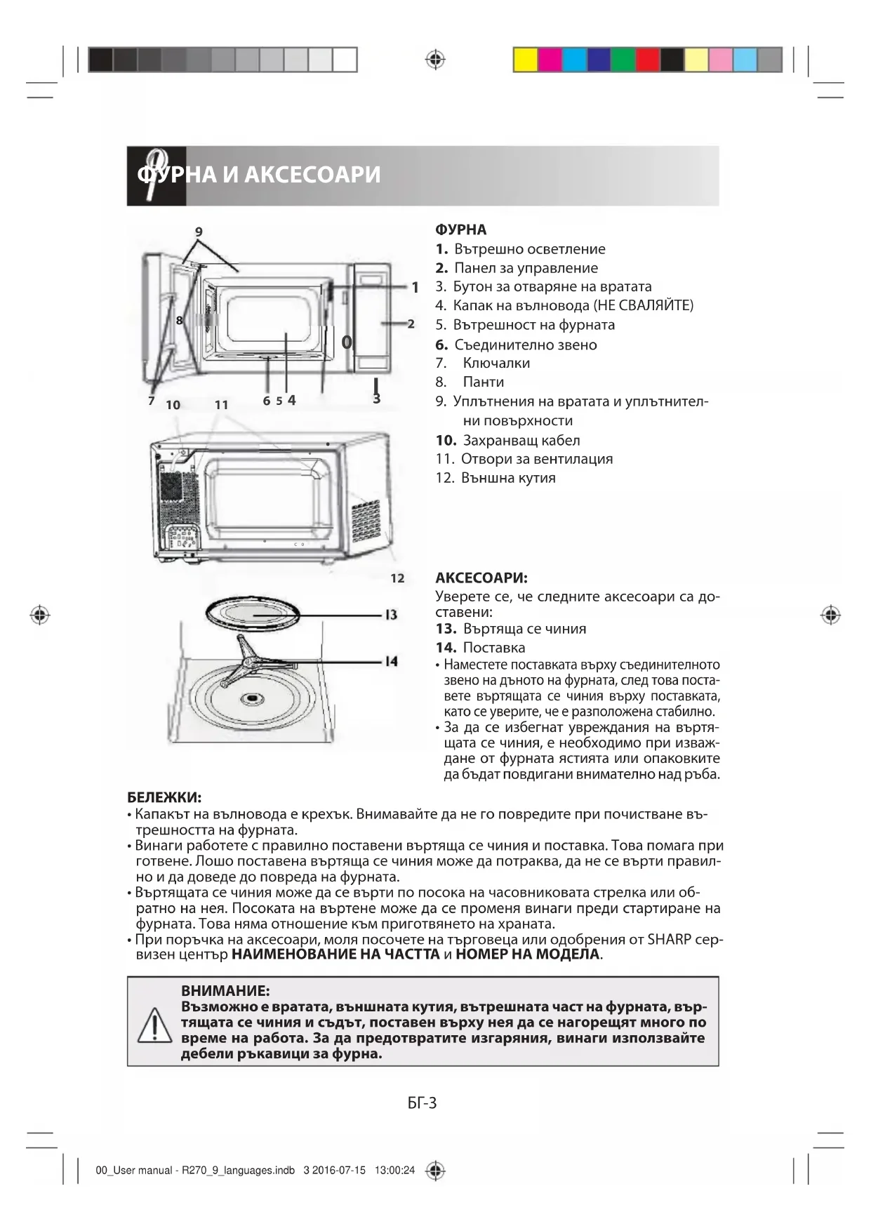 Възможно е вратата, външната кутия, вътрешната част на фурната, вър- тящата се чиния и съдът, поставен върху нея да се нагорещят много по време на работа. За да предотвратите изгаряния, винаги използвайте дебели ръкавици за фурна. 00_User manual - R270_9_languages.indb 3 2016-07-15 13:00:24БГ-4