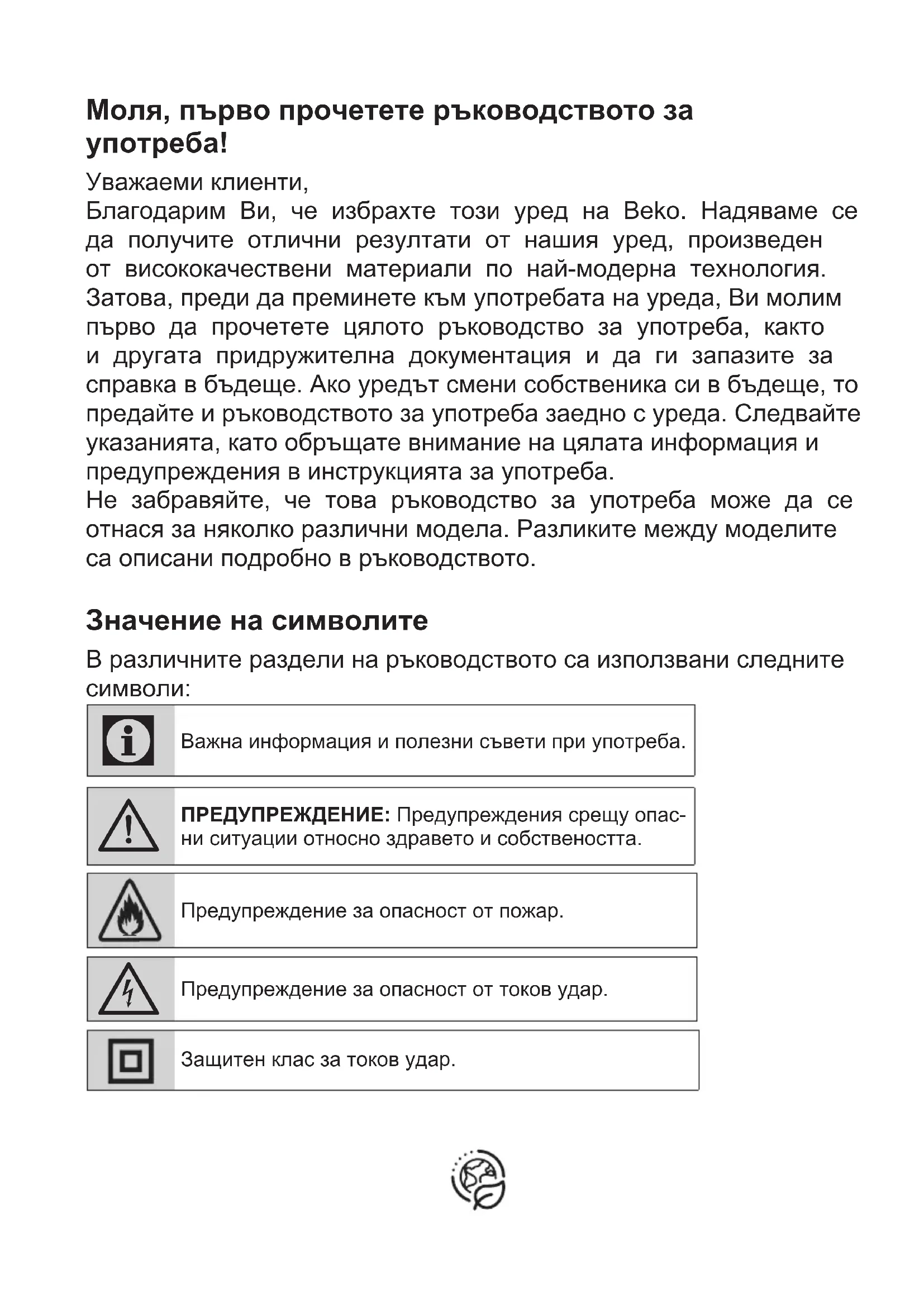 Уважаеми клиенти, Благодарим Ви, че избрахте този уред на Beko. Надяваме се да получите отлични резултати от нашия уред, произведен от висококачествени материали по най-модерна технология. Затова, преди да преминете към употребата на уреда, Ви молим първо да прочетете цялото ръководство за употреба, както и другата придружителна документация и да ги запазите за справка в бъдеще. Ако уредът смени собственика си в бъдеще, то предайте и ръководството за употреба заедно с уреда. Следвайте указанията, като обръщате внимание на цялата информация и предупреждения в инструкцията за употреба. Не забравяйте, че това ръководство за употреба може да се отнася за няколко различни модела. Разликите между моделите са описани подробно в ръководството. Значение на символите В различните раздели на ръководството са използвани следните