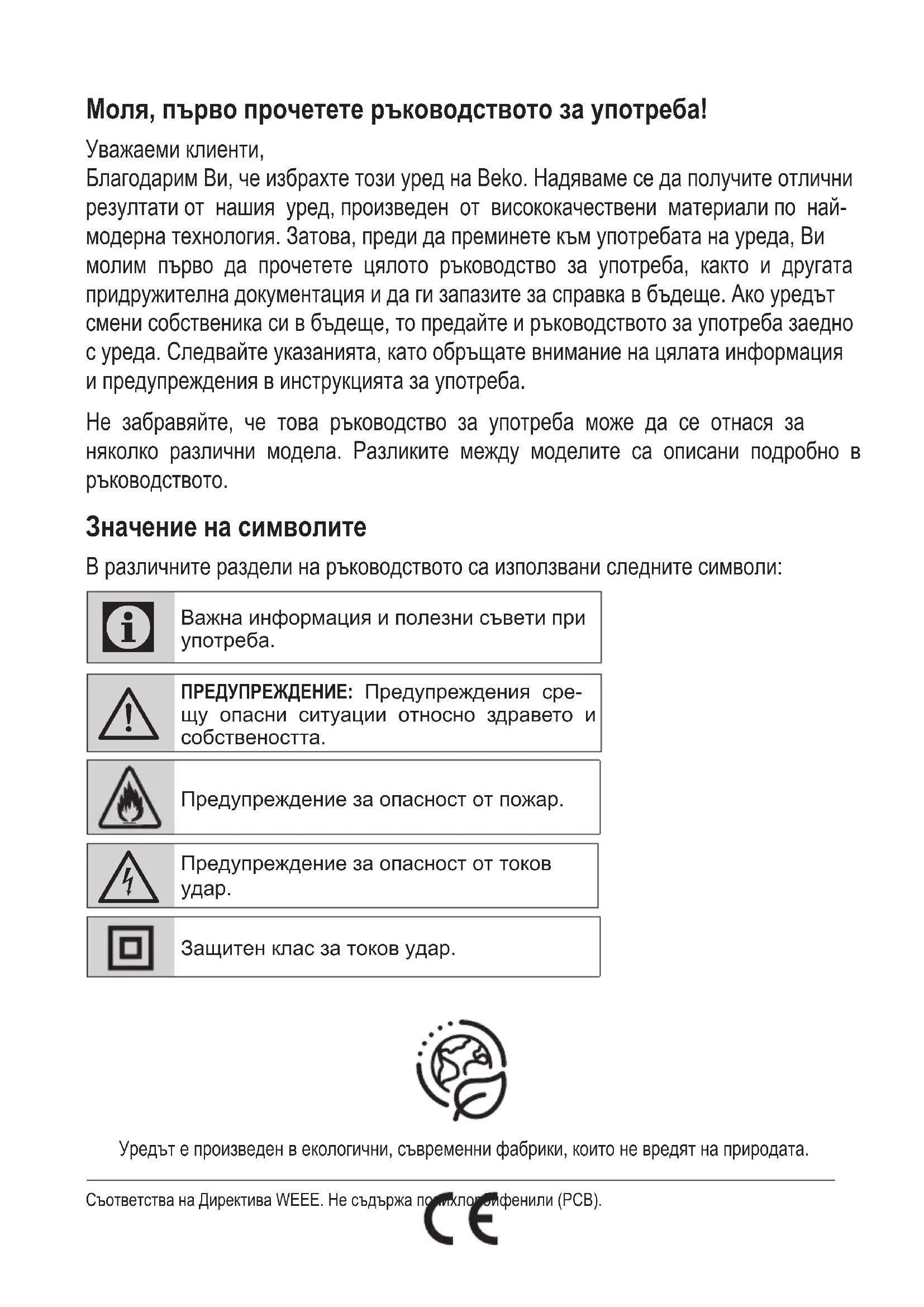 - застосовується до витяжок з сенсорною панеллю. Якщо не вдається вирішити проблему, дотримуючись наведених вище рекомендацій, зверніться до авторизованого сервісу побутової техніки, який має право виконувати ремонт. Користувачу категорично забороняється самостійно виконувати ремонт. Див. перелік сервісних пунктів на гарантійному талоні та на веб-сайті.Моля, първо прочетете ръководството за употреба! Уважаеми клиенти, Благодарим Ви, че избрахте този уред на Beko. Надяваме се да получите отлични резултати от нашия уред, произведен от висококачествени материали по най- модерна технология. Затова, преди да преминете към употребата на уреда, Ви молим първо да прочетете цялото ръководство за употреба, както и другата придружителна документация и да ги запазите за справка в бъдеще. Ако уредът смени собственика си в бъдеще, то предайте и ръководството за употреба заедно с уреда. Следвайте указанията, като обръщате внимание на цялата информация и предупреждения в инструкцията за употреба. Не забравяйте, че това ръководство за употреба може да се отнася за няколко различни модела. Разликите между моделите са описани подробно в ръководството. Значение на символите В различните раздели на ръководството са използвани следните символи: