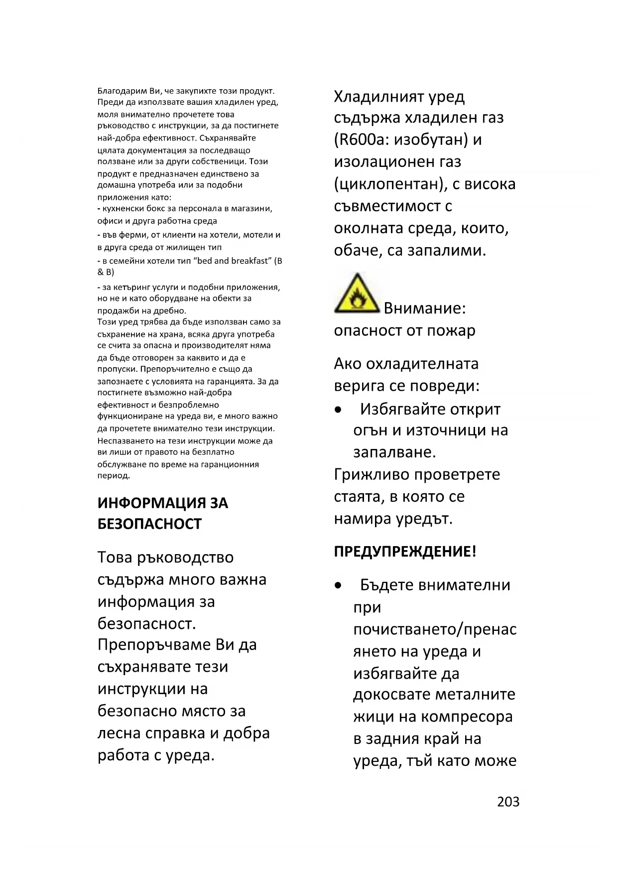 ИНФОРМАЦИЯ ЗА БЕЗОПАСНОСТ Това ръководство съдържа много важна информация за безопасност. Препоръчваме Ви да съхранявате тези инструкции на безопасно място за лесна справка и добра работа с уреда. Хладилният уред съдържа хладилен газ (R600a: изобутан) и изолационен газ (циклопентан), с висока съвместимост с околната среда, които, обаче, са запалими.