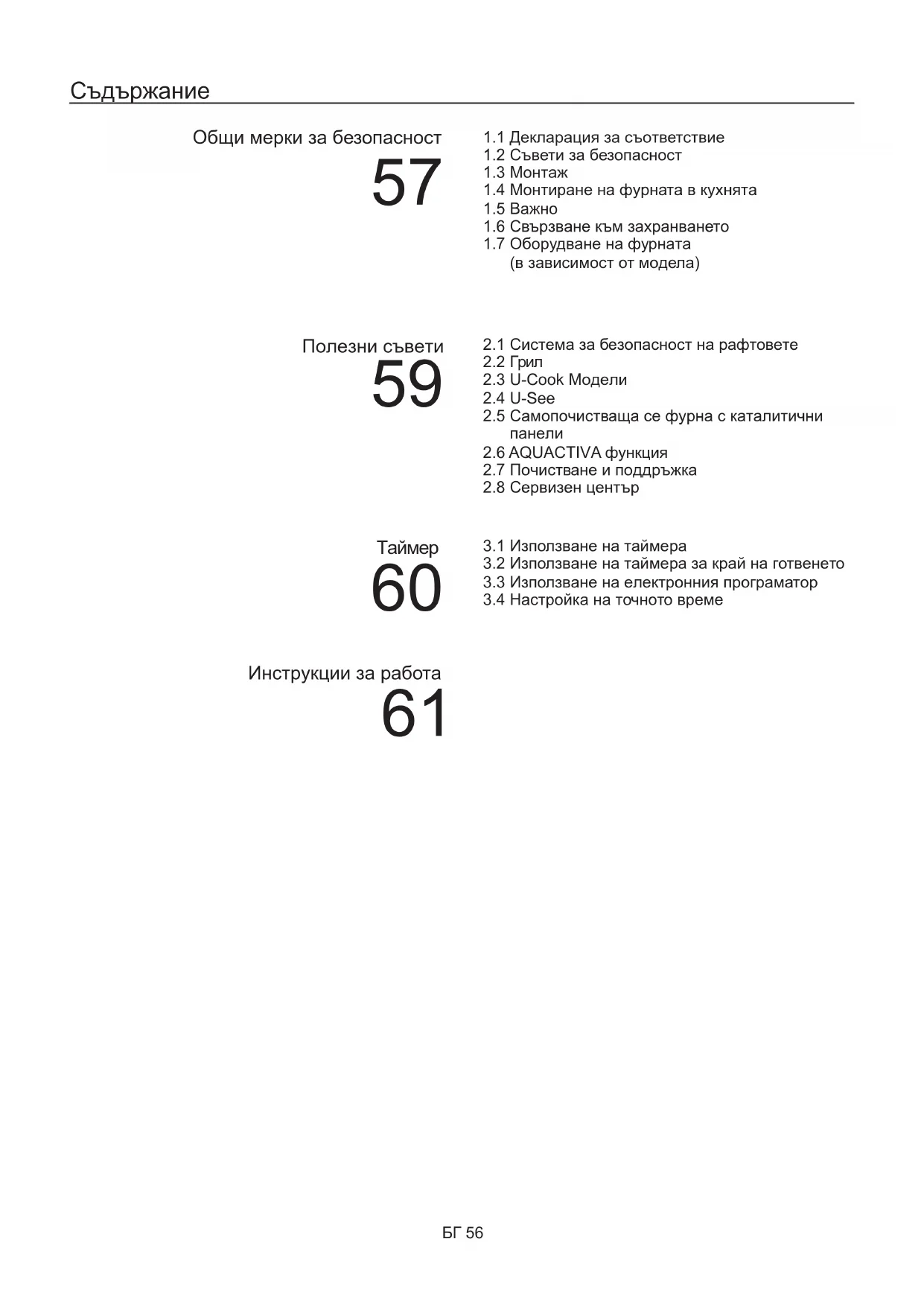 - когато купувате нов уред, старият може да бъде върнат на търговеца, който да го приберете безплатно на база едно-към едно, докато оборудването е от същия тип има същите функции като доставеното оборудванеСПЕСТЯВАНЕ НА ЕНЕРГИЯ И ОПАЗВАНЕ НА ОКОЛНАТА СРЕДА Когато е възможно избягвайте предварителното загряване на фурната. По време на готвене отваряйте вратата на фурната възможно най-малко, защото при всяко отваряне се губи топлина. За значителна икономия на енергия изключете фурната 5 – 10 минути преди планираният край на времето за готвене и използвайте остатъчната топлина, която фурната продължава да генерира. За да избегнете загуба на топлина поддържайте чисти и в ред уплътненията на фурната. Ако имате различни тарифи за електрическата енергия използвайте отложеният старт, за да стартирате готвенето на по-ниската тарифа. БГ 61UA 62