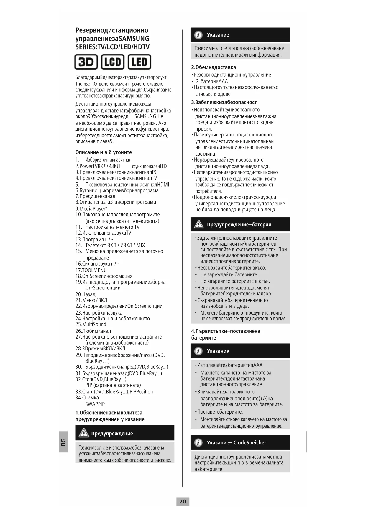 Благодарим Ви, че избрахте да закупите продукт Thomson. Отделете време ипрочетете изцяло следните указания иинформация. Съхранявайте упътването за справка на сигурно място. Дистанционното управление може да управлява сдоставената фабрична настройка около 90% от всички уреди SAMSUNG